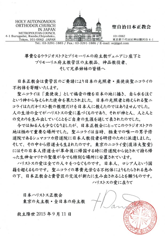По просьбе вашей митрополии Японская Автономная Православная Церковь приносит в дар святые мощи святого равноапостольного НИКОЛАЯ, просветителя Японии.