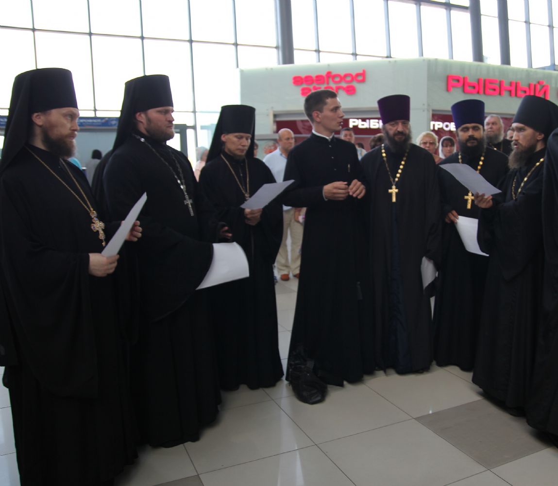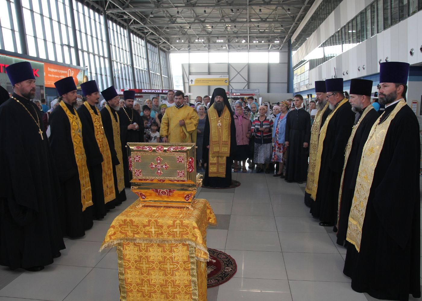 Из аэропорта святые мощи были доставлены в Покровский кафедральный собор для торжественной встречи. Митрополит Владивостокский и Приморский Вениамин возглавил в храме служение Соборного молебна. Торжественную встречу святыни посетил вице-губернатор Приморского края по вопросам внутренней политики Александр Ролик.