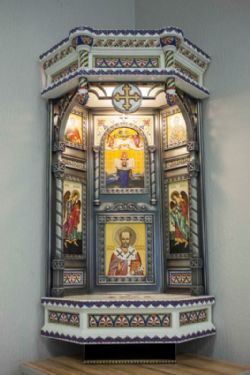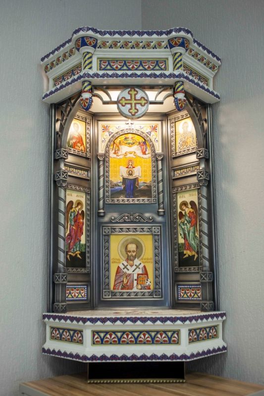 – Основа иконостаса изготовлена из посеребренной бронзы, сами иконы – керамические. Иконостас включает иконы Божией Матери "Порт-Артурская", святителя Спиридона Тримифунтского, святителя Николая Мирликийского, великомученика и целителя Пантелеимона, архангелов Михаила и Гавриила. Задача была – в малые размеры киота вписать эти образы, совместить керамику с металлодекором, чтобы это воспринималось гармонично. Надеюсь, он прослужит многие годы, а может, и века.