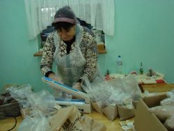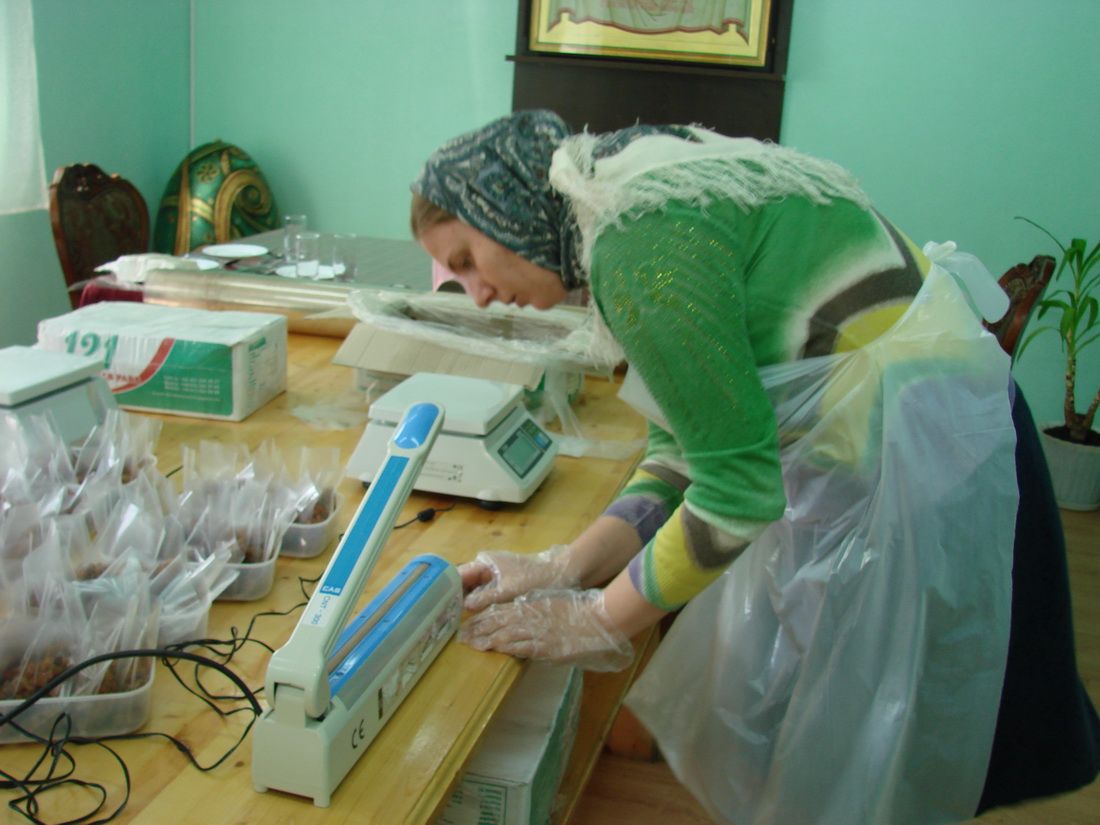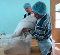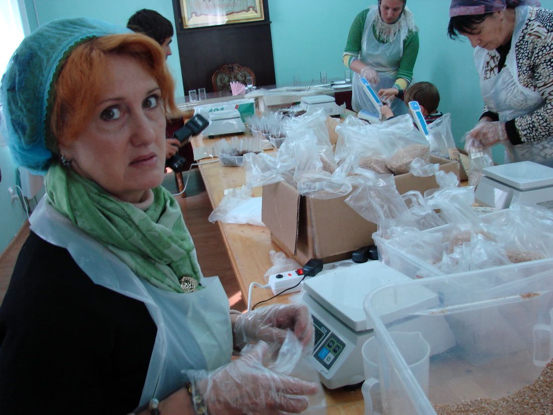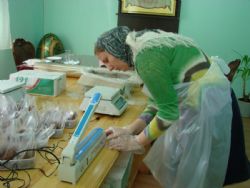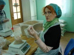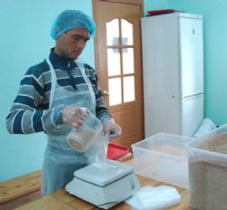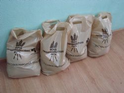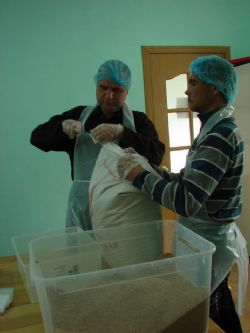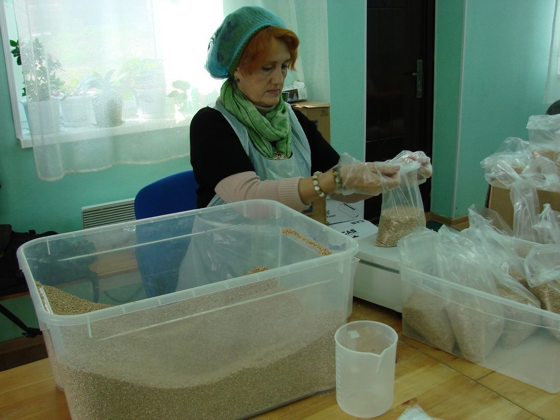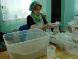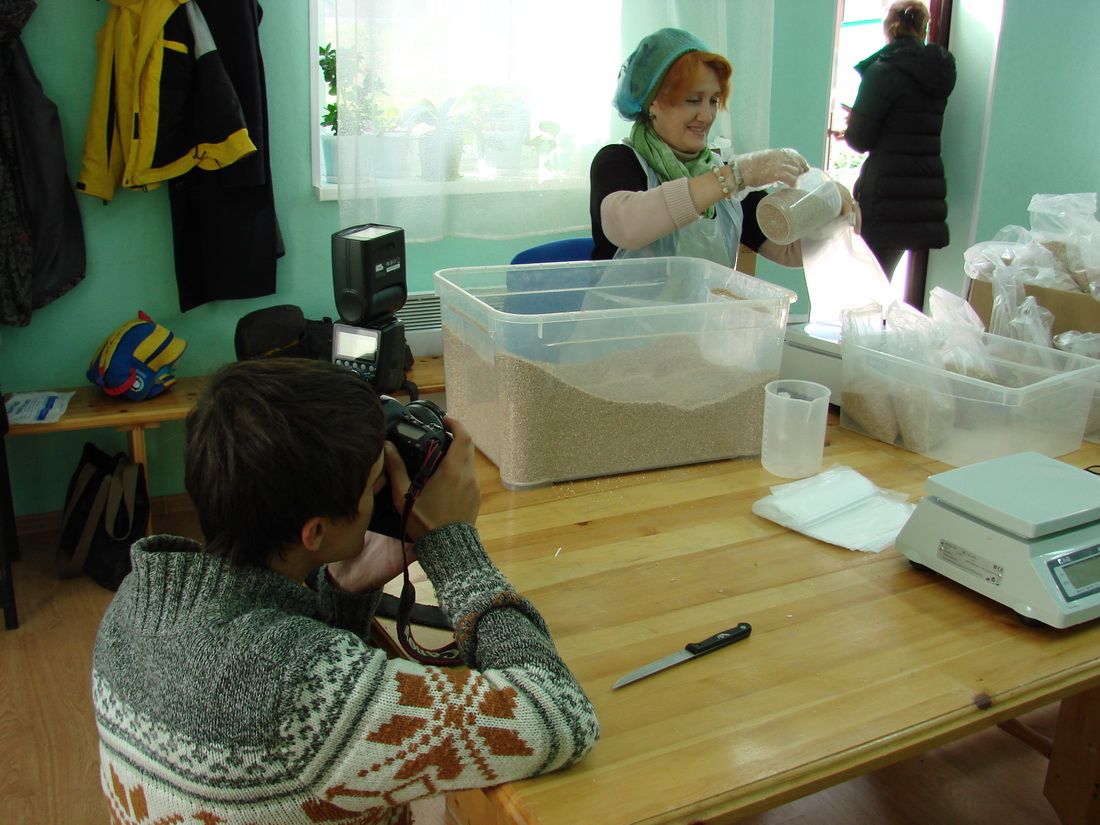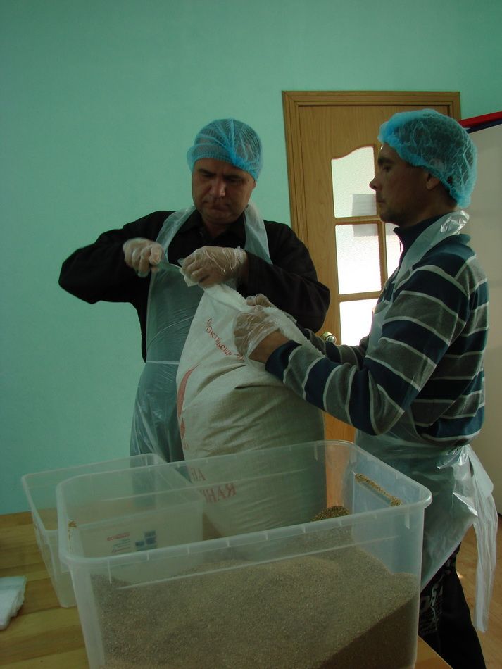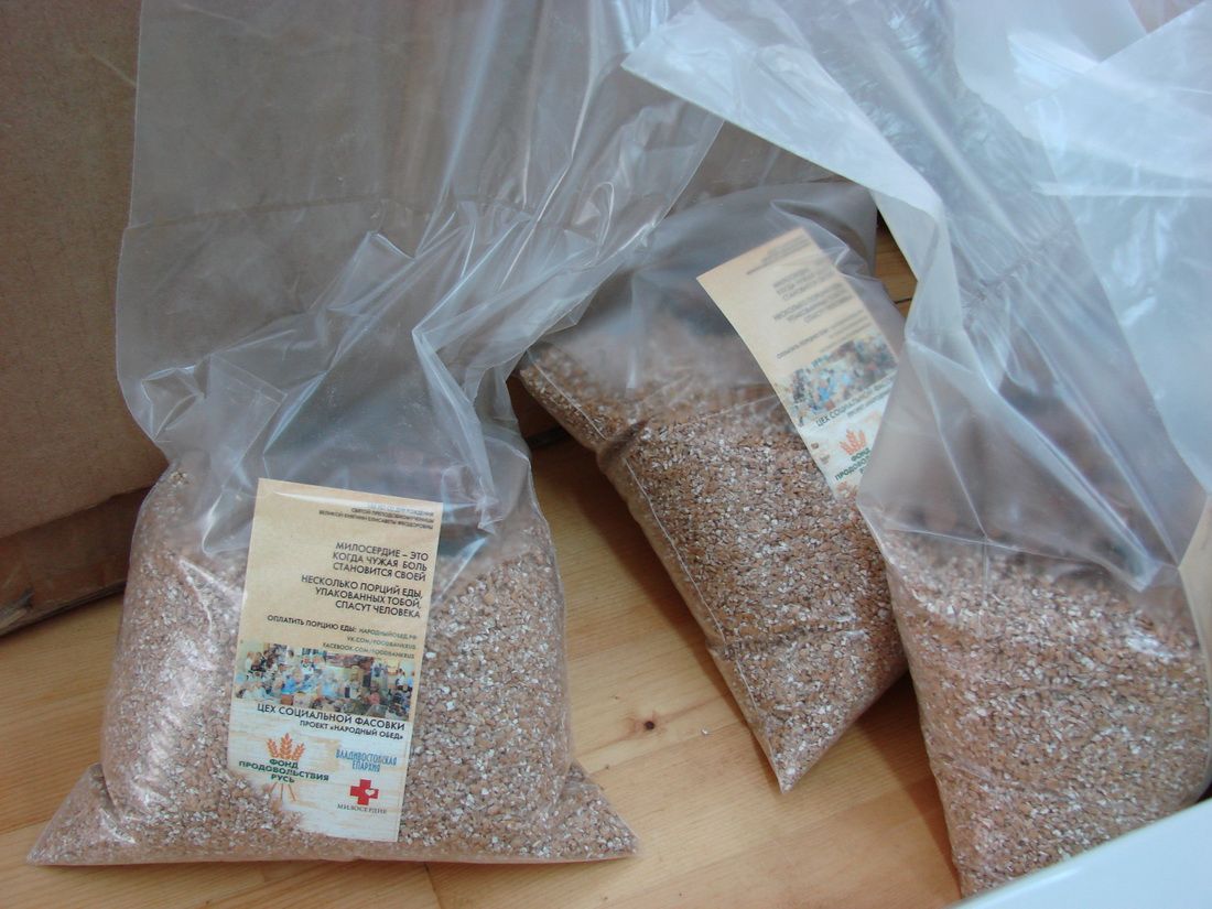 В этот раз на одну порцию фасовали по 500 г. крупы «Артек» и 30 граммов изюма. В каждый большой пакет укладывали по 4 порционных. Мы всё взвешиваем, порционные пакеты запаиваем.