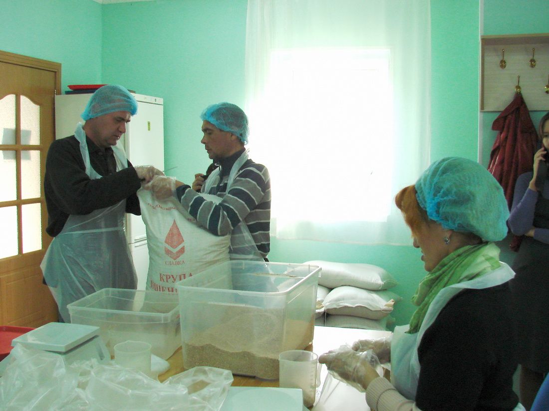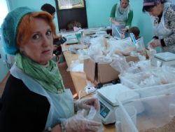 Мы собираемся для фасовки два раза в месяц. Сегодня по разным причинам к началу фасовки собрались далеко не все, кто собирался. Вот-вот будут беженцы из Украины. Они нам тоже помогают фасовать «Народные обеды» и сами являются адресатами нашей, в том числе и продовольственной, помощи. Помогать фасовать приходят и многодетные семьи.
