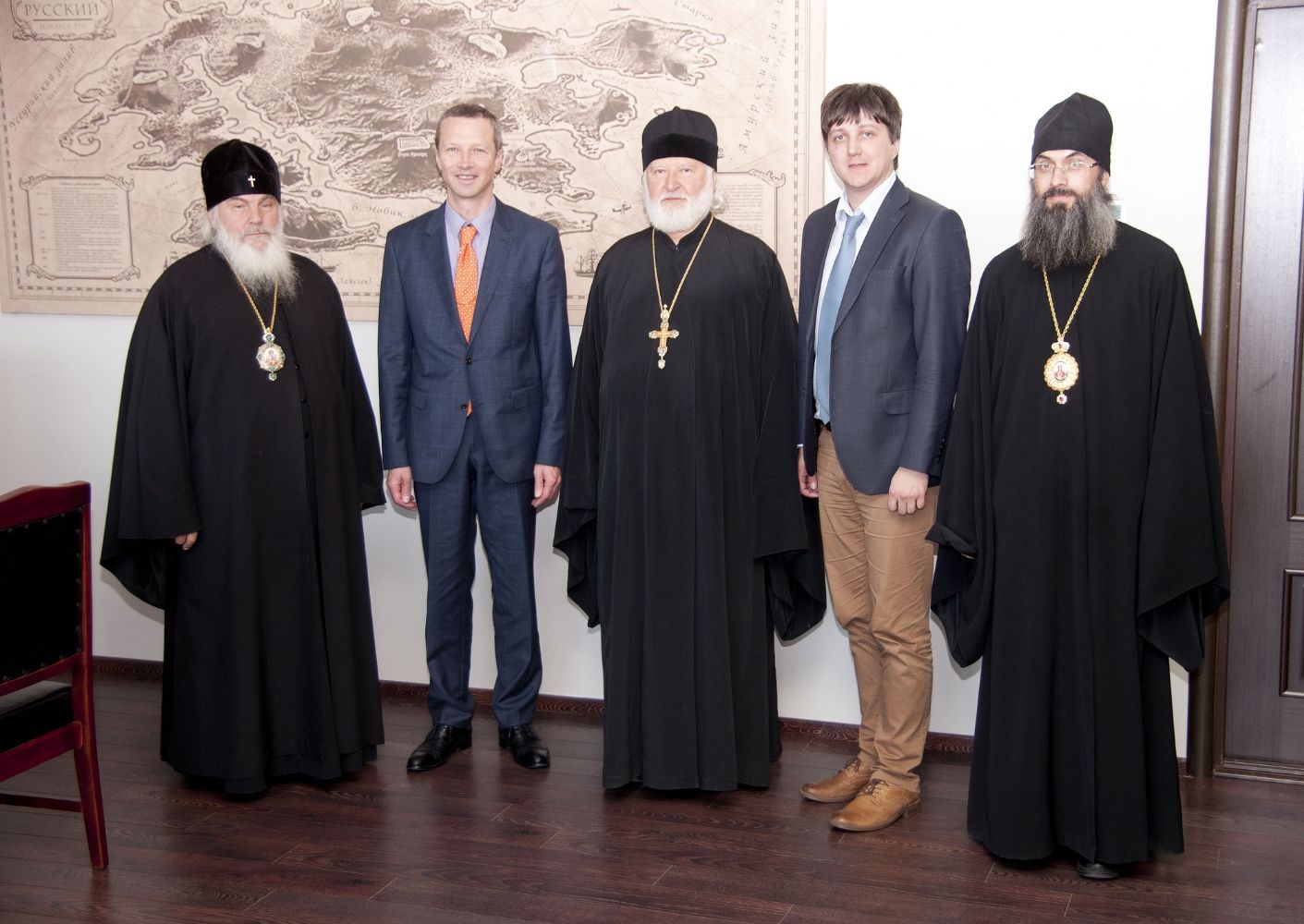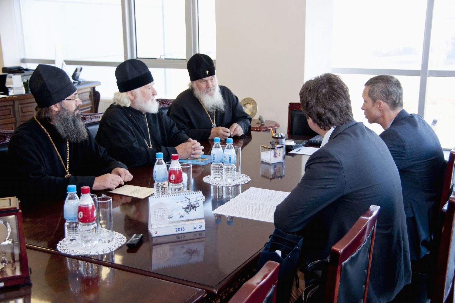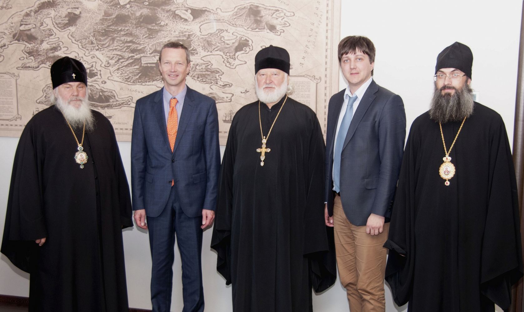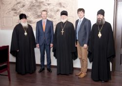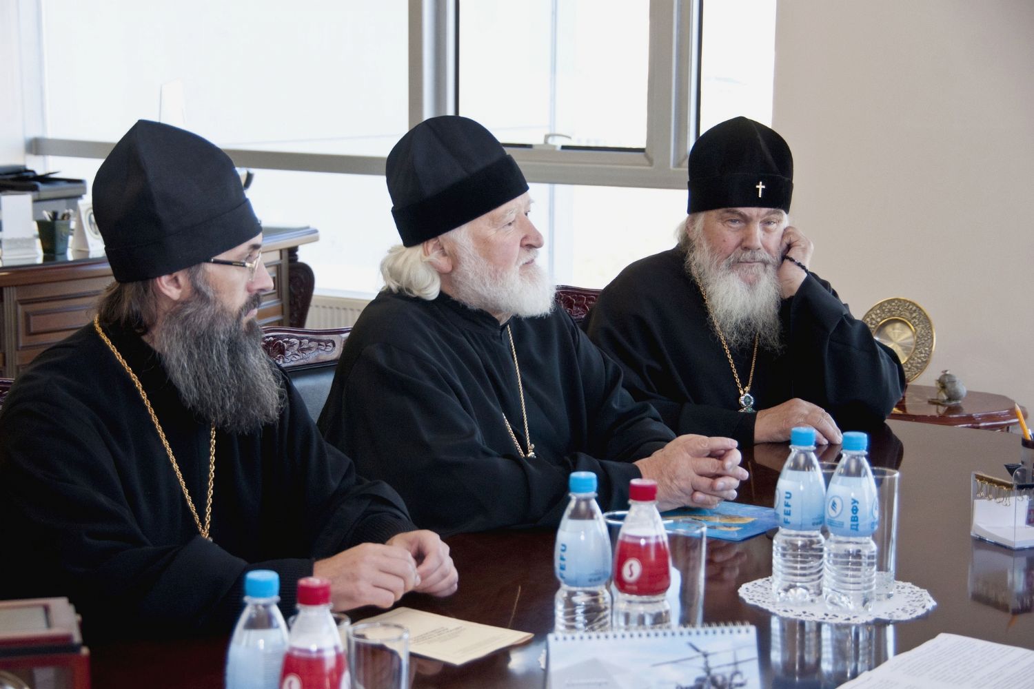 На встрече присутствовали: митрополит Владивостокский и Приморский Вениамин; епископ Уссурийский Иннокентий, викарий Владивостокской епархии; директор Школы гуманитарных наук ДВФУ Феликс Ажимов.