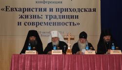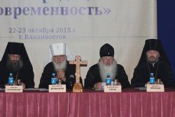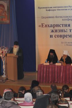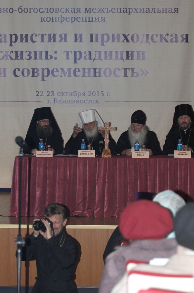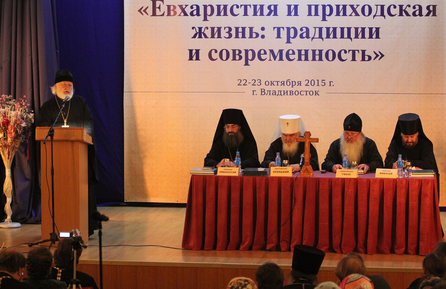 Владивосток. Научная богословская межъепархиальная конференция «Евхаристия и приходская жизнь: традиции и современность» открылась в приморской столице 22 октября 2015 года. Представители ведущих богословских вузов страны обсуждают один из важнейших вопросов христианской веры – Евхаристию (Причащение Святых Христовых Таинств). Конференция продолжит свою работу в течение двух дней, в числе ее участников более трехсот человек – архиереи Дальнего Востока, священники приходов Приморской митрополии, прихожане, педагоги и студенты Дальневосточного федерального университета, Владивостокского Духовного училища, жители Владивостока, интересующиеся вопросами духовной жизни. На открытии конференции работала съемочная группа «Общественного телевидения Приморья».