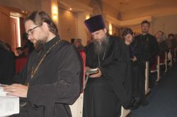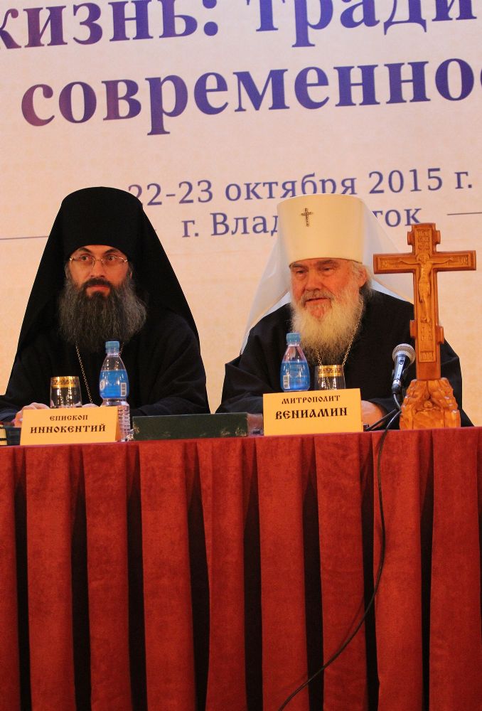 Масштабная встреча в Казанском храме Владивостока началась с Божественной Литургии, служение которой возглавил митрополит Владивостокский и Приморский Вениамин. За богослужением молились: викарий Владивостокской епархии епископ Уссурийский Иннокентий; епископ Находкинский и Преображенский Николай; клир Приморской митрополии. Высокопреосвященнейшему Владыке сослужили: духовенство Владивостока и участники конференции – кандидат богословия, доцент Московской Духовной Академии протоиерей Павел Великанов; и кандидат богословия, преподаватель Санкт-Петербургской Духовной Академии протодиакон Константин Маркович.