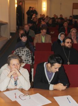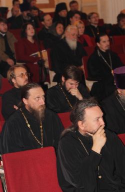 Первым с докладом выступил доктор богословия НС, профессор, ректор Православного Свято-Тихоновского гуманитарного университета (г.Москва) протоиерей Владимир Воробьев. Темой его доклада стала «Евхаристия и приходская община». Священник привел целый ряд примеров, показывающих, что регулярное причащение – сплачивает приходскую общину. Такой процесс он обозначил специальным термином «Евхаристическая община», считая подобные общины – основой Церкви.
