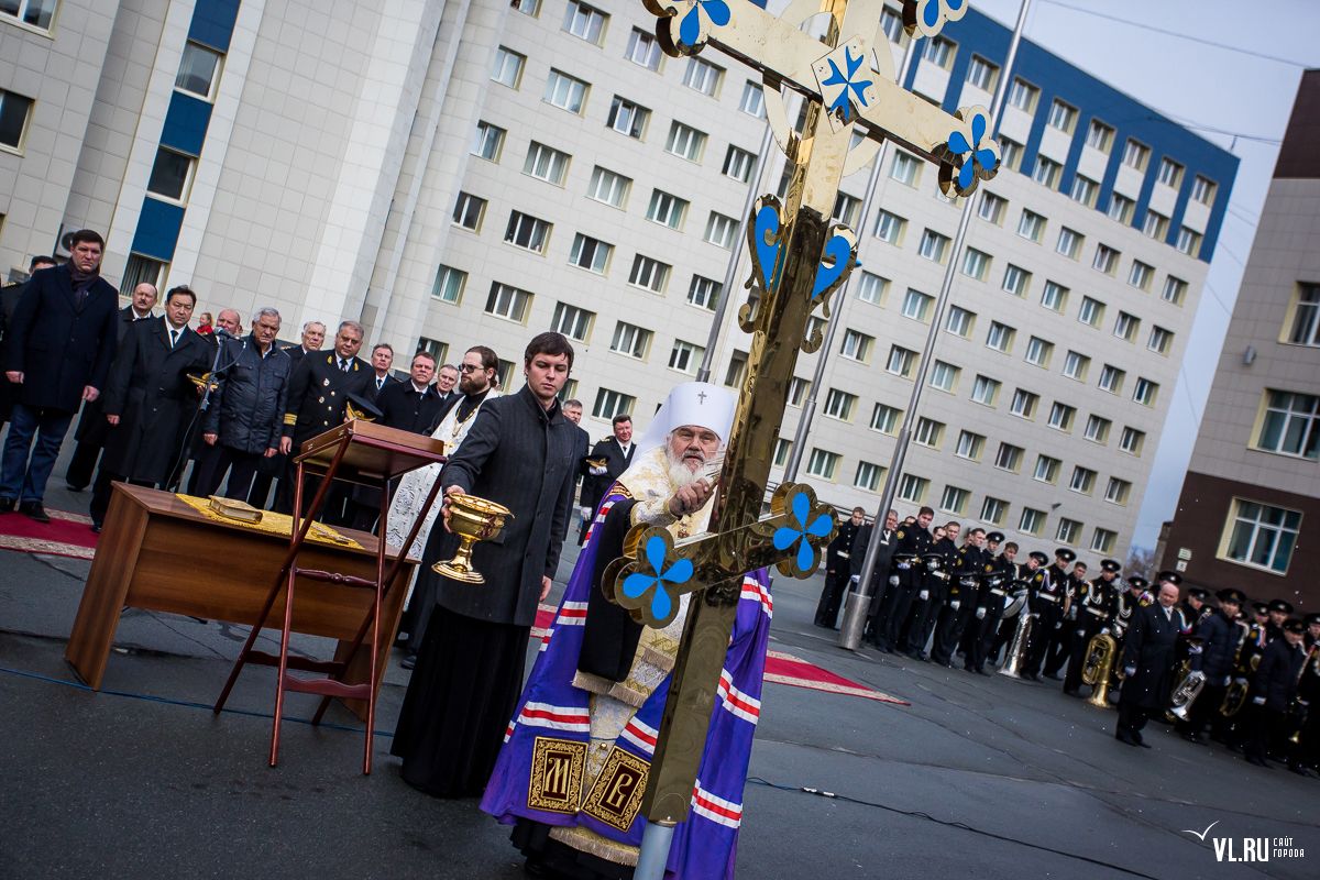 Владивосток. 14 ноября 2015 года в Морском государственном университете имени адм.Г.И.Невельского митрополит Владивостокский и Приморский Вениамин совершил краткий молебен и чин освящения креста на купол храма в честь святителя Николая чудотворца. Высокопреосвященнейшему владыке сослужили: благочинный I округа епархии о.Димитрий Федорин и клирик Казанского храма Владивостока иерей Роман Бурдинский. После освящения крест был водружен на купол храма.
