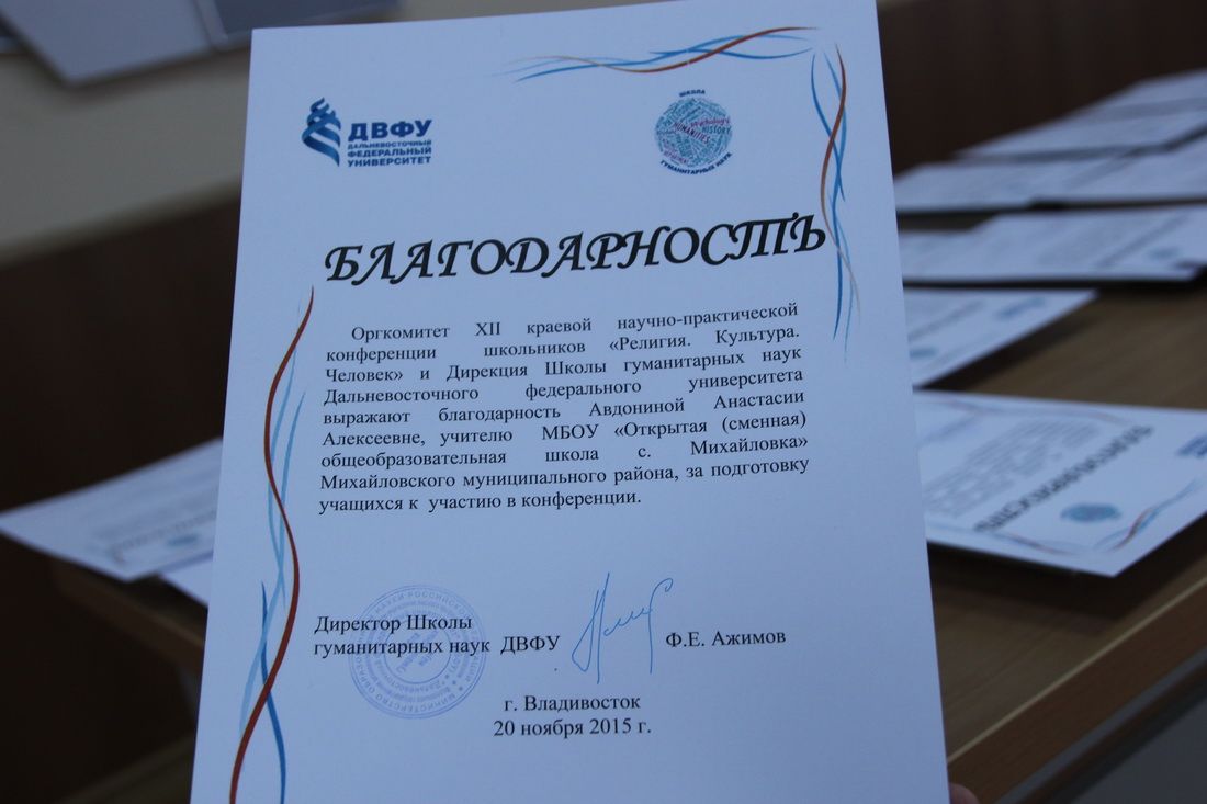 Владивосток. 20 ноября 2015 г. в Приморском краевом институте развития образования состоялась ХII краевая научно-практическая конференция школьников «Религия. Культура. Человек». Она проходила в рамках Всероссийского форума «Традиции и новации: культура, общество, личность».