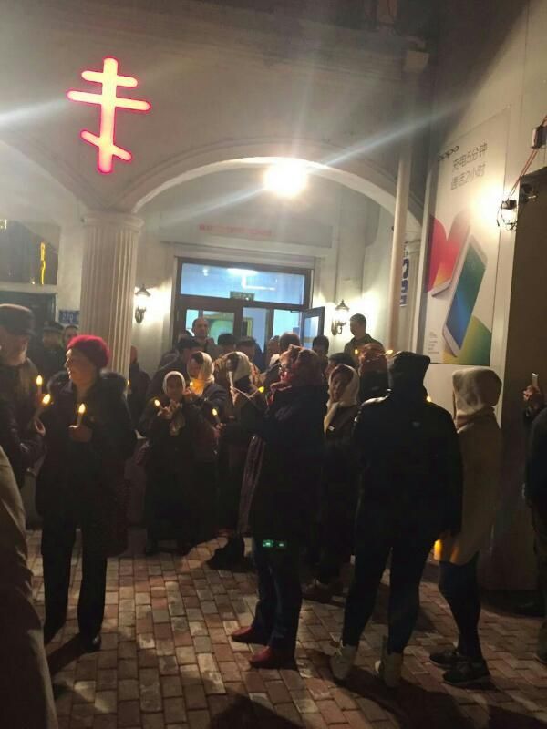 Утром 16 апреля, в главном зале католического собора, служилась праздничная Пасхальная Литургия. (Покровский храм всё ещё закрыт и богослужения в нём совершать не разрешают, ни русским, ни китайцам).