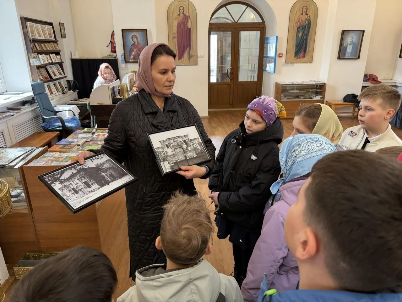 Преподаватель рассказала об устройстве православного храма и его значении. Ребята с интересом рассматривали иконы, среди которых узнали прп. Сергия Радонежского, св. блгв. князя Александра Невского, вмч. Георгия Победоносца и других святых.