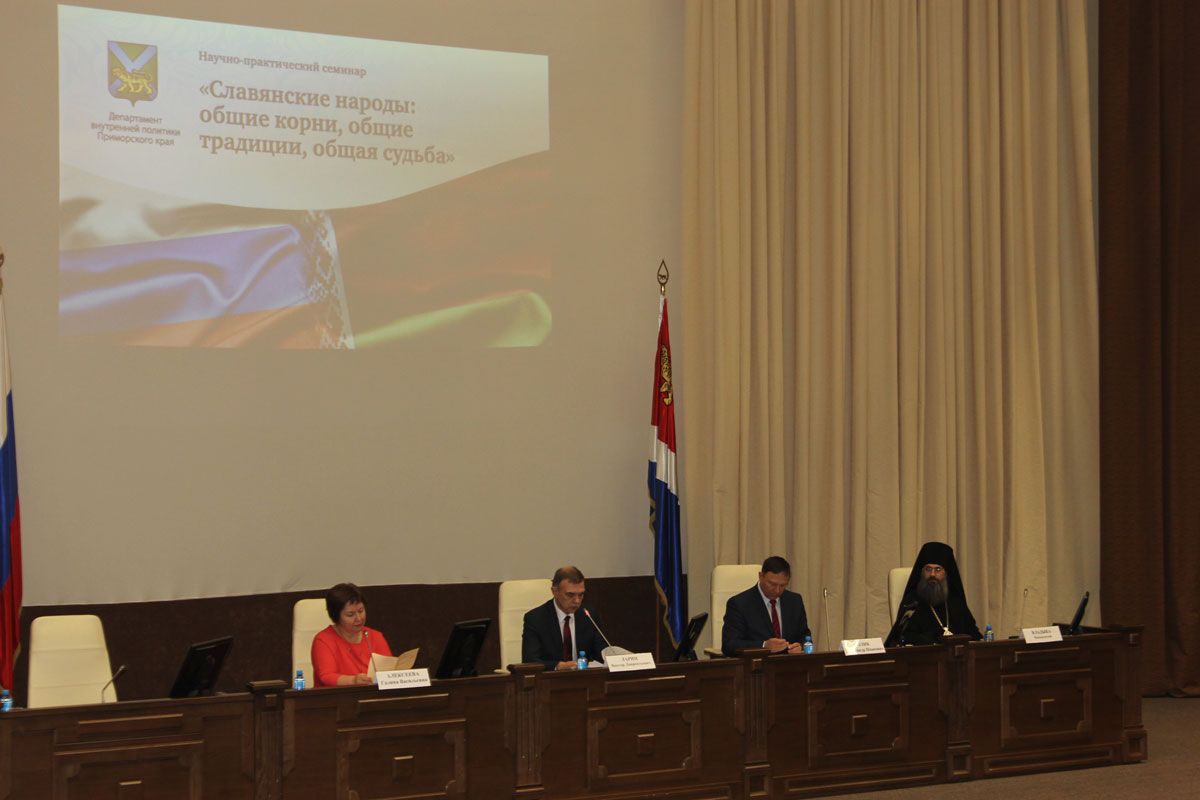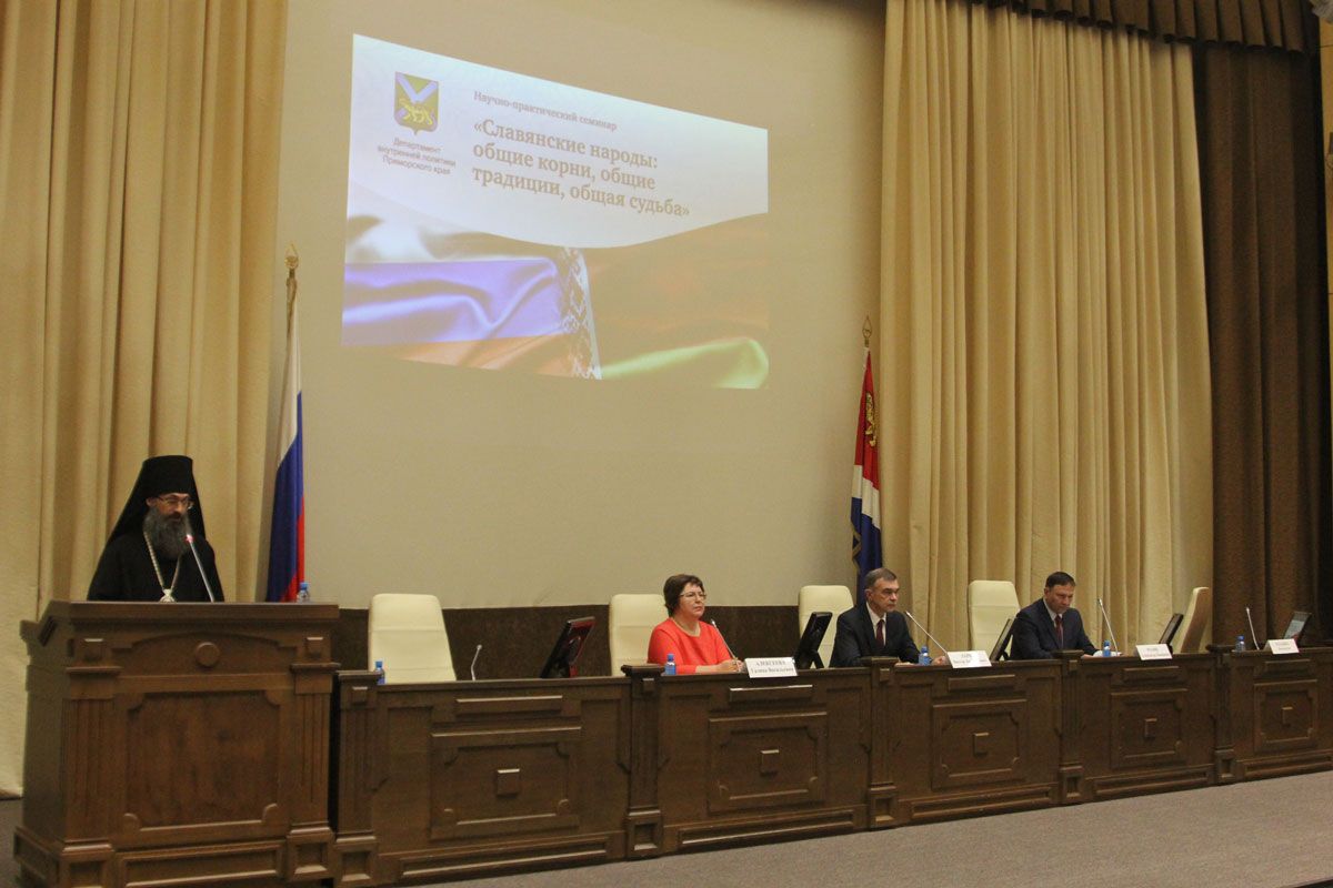 Владивосток. Викарий Владивостокской епархии епископ Уссурийский Иннокентий принял участие в работе научно-практического семинара «Славянские народы: общие корни, общие традиции, общая судьба». Мероприятие прошло в краевой администрации и было приурочено к празднованию Дня единения России и Беларуси. Среди участников – вице-губернатор Приморья Александр Ролик, председатель Общественной палаты Виктор Ларин, руководитель Ассамблеи народов Приморья Галина Алексеева. Организовали семинар Департамент внутренней политки Приморского края, а также институт истории и этнографии Дальневосточного отделения наук РАН.