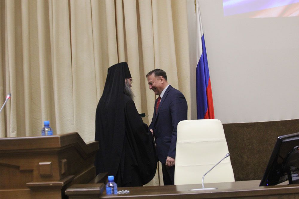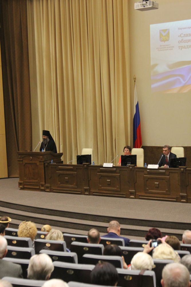 Епископ Иннокентий выступил с приветственным словом к участникам и гостям мероприятия, обратив внимание слушателей на важность сохранения исторического единства и исторических корней основы Русского мира - народов России, Украины и Беларуси. Владыка отметил большой вклад администрации края в работу по формированию национальных культурных ценностей и межнационального единства.