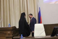 По благословению митрополита Владивостокского и Приморского Вениамина викарий епархии вручил вице-губернатору Приморского края Александру Ролику Патриаршую грамоту и знак «700-летие преподобного Сергея Радонежского» и поблагодарил Александра Ивановича за многолетнюю и целенаправленную работу по укреплению культурных традиций Русского мира в Приморье.