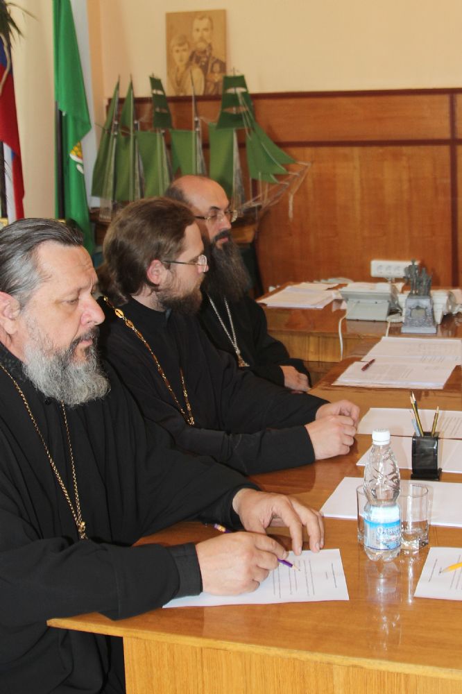 Владивосток. Очередное заседание Епархиального совета прошло в рабочей резиденции митрополита Владивостокского и Приморского. На нем присутствовали члены Епархиального совета: викарий Владивостокской епархии епископ Уссурийский Иннокентий; секретарь епархии протоиерей Игорь Талько; руководитель отдела по взаимодействию с Вооруженными Силами протоиерей Виктор Жильцов; настоятель мужского монастыря прп. Серафима Саровского г. Владивостока игумен Климент (Кривоносов); настоятель храма Новомучеников и Исповедников Церкви Русской г. Владивостока протоиерей Андрей Машанов; благочинный I округа епархии иерей Димитрий Федорин.