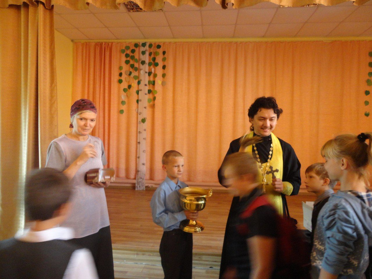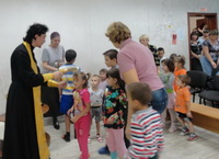 После выгрузки подарков в каждом детском учреждении в актовом зале отец Андрей отслужил молебен на начало учебного года. Молебны по традициям Православной Церкви совершаются в начале каждого учебного года. У детей из детских учреждений, которые поступили сюда в основном из неблагополучных семей, понятия о традициях весьма своеобразное. И такие малые встречи с Церковью может быть хотя бы некоторым из них послужат на пользу.
