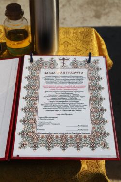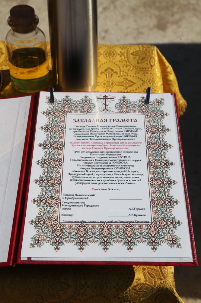 Перед вложением закладной капсулы в фундамент Свято-Максимовского храма был оглашен текст закладной грамоты: «Во славу Святыя, Единосущныя и Нераздельныя Троицы, Отца и Сына и Святого Духа, при Великом Господине и отце нашем Патриархе Московском и всея Руси Кирилле, благословением Преосвященнейшего Николая епископа Находкинского и Преображенского, заложен камень и капсула с грамотой сей во основание храма в честь преподобного Максима Исповедника в граде Находка Приморского края, в лето 2016 от Рождества по плоти Господа Бога и Спасителя нашего Иисуса Христа в 11-й день октября месяца».