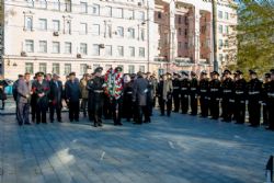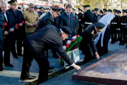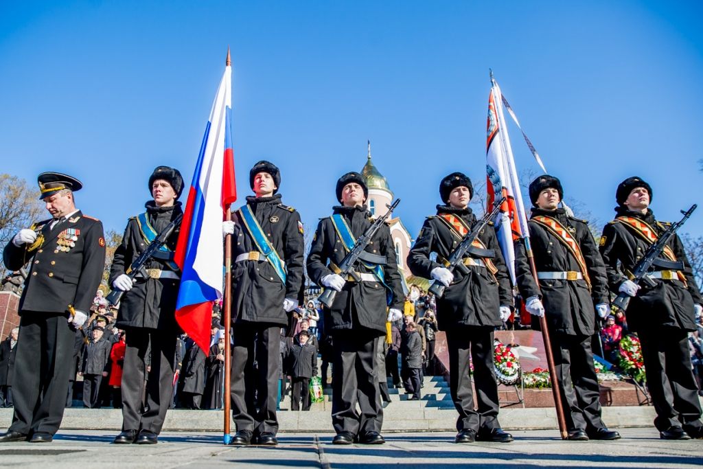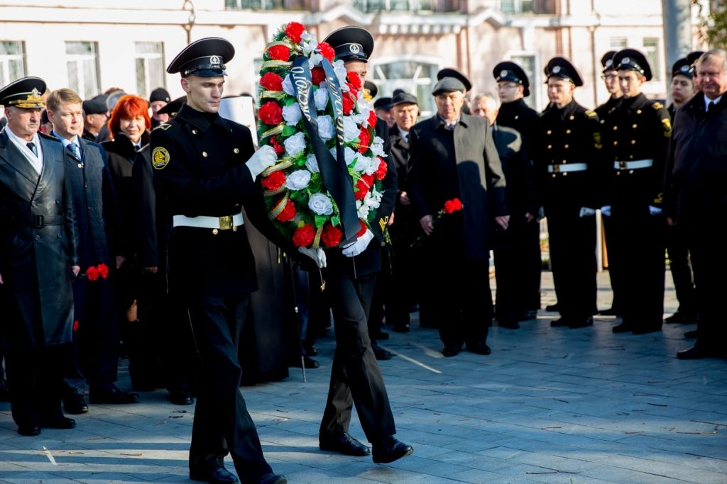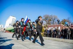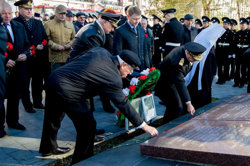 Далее участники возложили венки к военным мемориалам. Курсанты кадетского училища и служащие военно-морского флота возложили венки к памятнику экипажу шхуны "Крейсерок", памятнику Невельскому, памятнику морякам торгового флота и мемориалу «Боевая слава ТОФ».