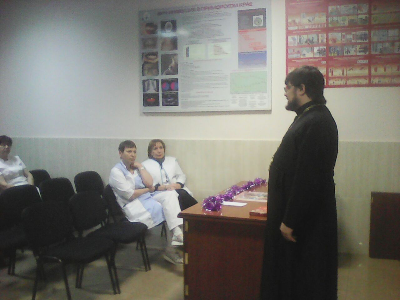 Владивосток. По благословению настоятеля храма в честь Святителя Николая Чудотворца протоиерея Василия Капитанюка, иерей Павел Иванчин вместе с певческим коллективом храма посетил "Спид-центр Приморская краевая клиническая больница №2", где состоялась встреча с медперсоналом больницы. Все желающие собрались в конференц зале. Встреча началась с беседы на тему значения праздника Рождества Христова. Затем, певчие исполнили несколько духовных и светских новогодних песнопений.
