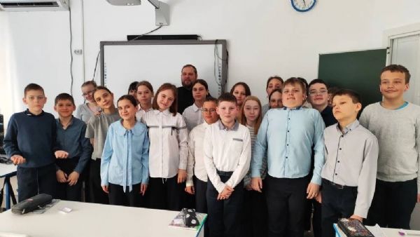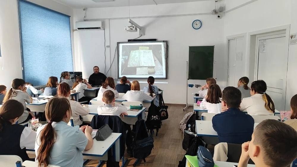 В ходе встречи отец Евгений рассказал ребятам об истоках отечественного книгопечатания, подробно остановившись на первой печатной книге — «Апостоле» и её издателе, первопечатнике Иване Фёдорове. Священнослужитель отметил, что именно выход в свет «Апостола» стал отправной точкой для развития просвещения и культуры в России. Отец Евгений показал детям старинное богослужебное Евангелие 1912 года, что позволило школьникам прикоснуться к живой истории православной книги.