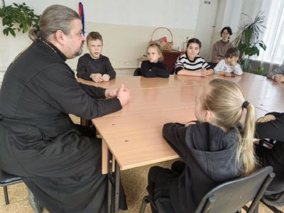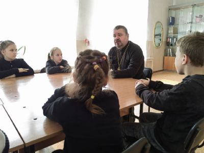Дети внимательно слушали священника, встреча прошла в теплой атмосфере.