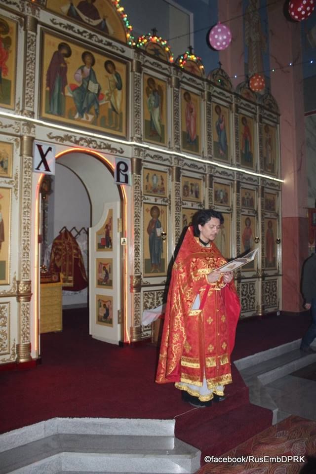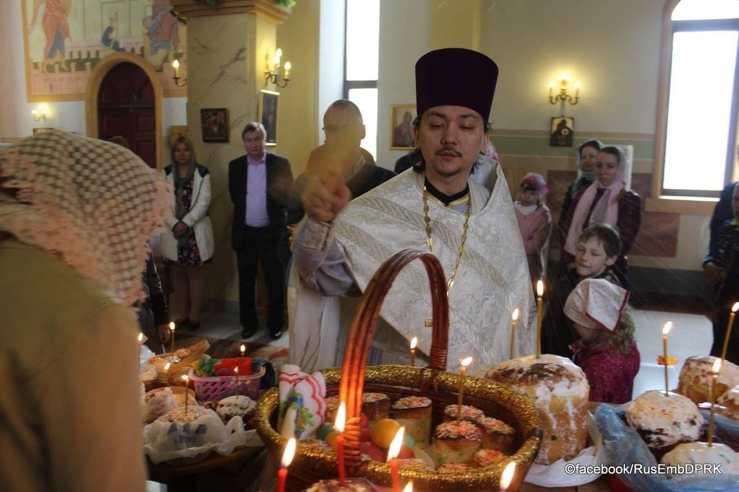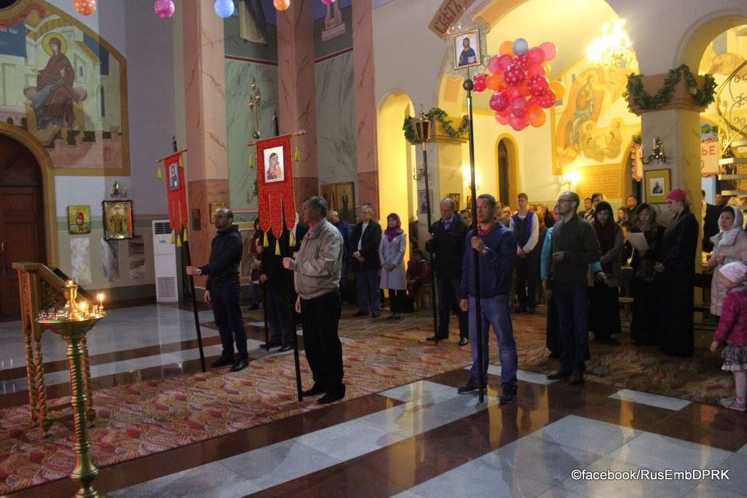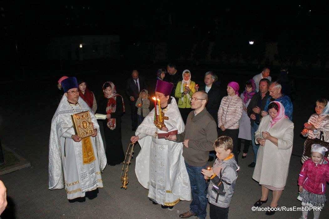 В полночь Крестным ходом началось Пасхальное богослужение. В нём приняли участие: Чрезвычайный и Полномочный Посол России в КНДР Александр Мацегора; сотрудники Посольства РФ в КНДР и члены их семей; главы дипломатических миссий Франции, Румынии, а также сотрудники Посольства Монголии.