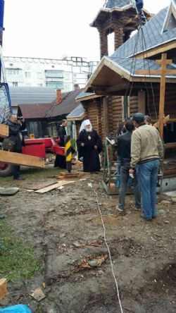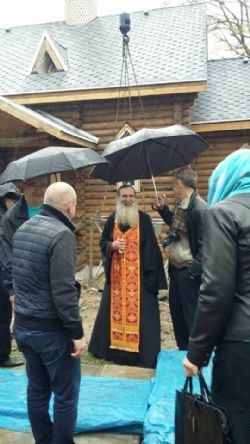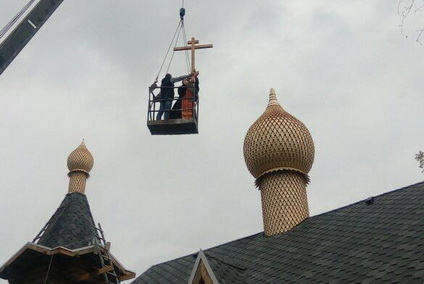 После чина освящения крестов отец настоятель иеромонах Палладий вместе с помощником подняли и установили кресты на купол храма и на купол колокольни. Первая литургия планируется на праздник Троицы, 4 июня 2017 года.