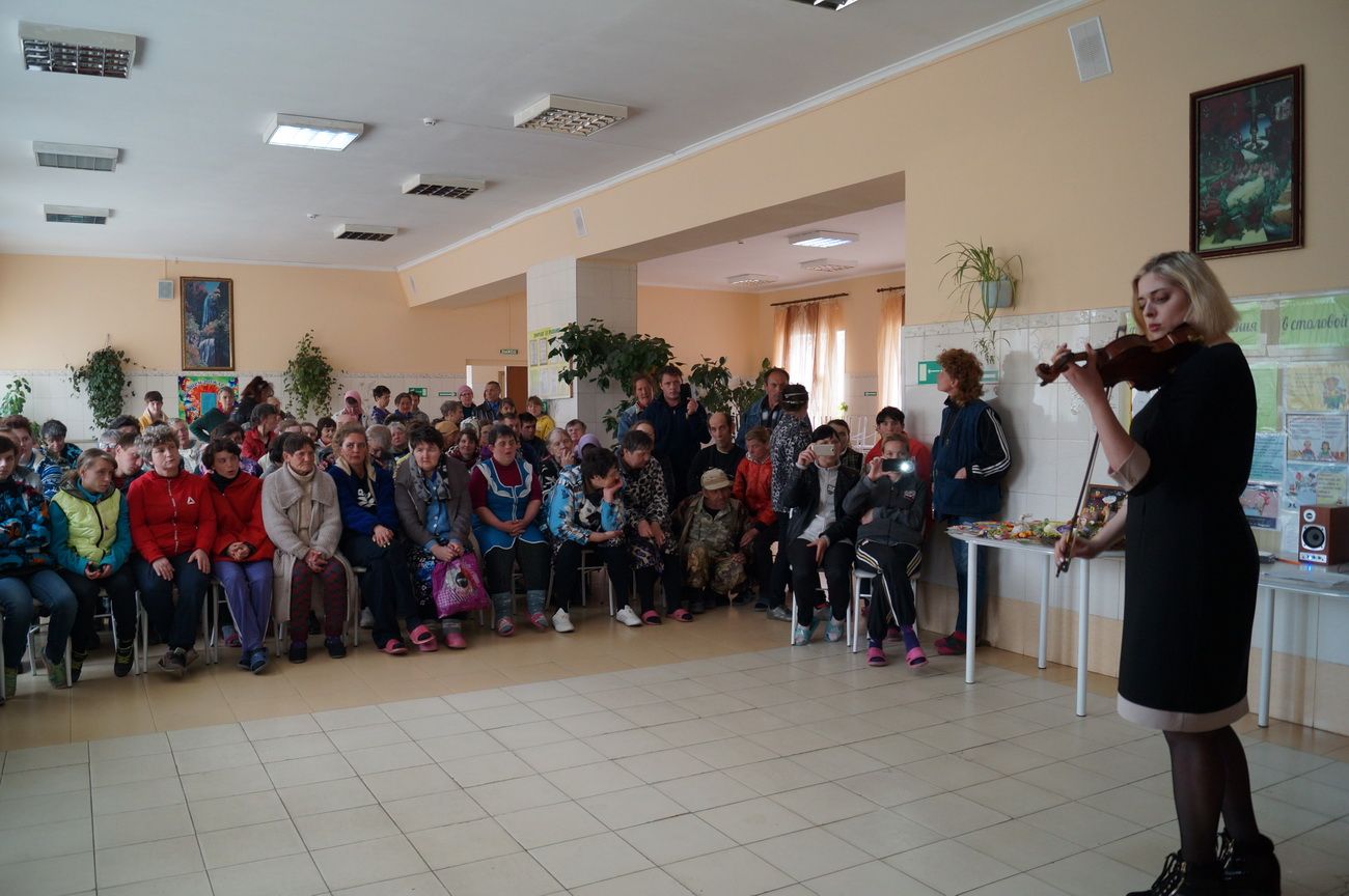 Владивосток. 30 апреля 2017 года волонтёры Социально-просветительского центра «Объятия Отча» храма св. блгв. кн. Игоря Черниговского совместно с преподавателями, учениками и родителями Епархиальной воскресной школы «Серафимов ручеек» совершили социально-просветительскую поездку в психоневрологический диспансер в п. Тихий. Учителя и ребята выступили с пасхальной программой, которая включала пасхальные песнопения, танцы, игру на музыкальных инструментах и др. Профессиональной игрой на скрипке порадовала пациентов и работников интерната лауреат международных конкурсов Лариса Бурнаева. На музыкальных инструментах сыграли ученики школы: Владислав Федотов - флейта, Макар Тропин - балалайка, Злата-Есина аккордеон и танец с ложками.