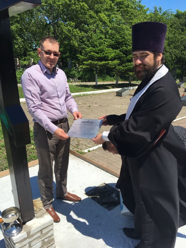 Владивосток. 15 июня 2017 года помощник благочинного I округа протоиерей Андрей Машанов на месте строительства часовни в честь Всех Святых на Морском кладбище освятил закладной камень и вложил в него капсулу с закладной грамотой.