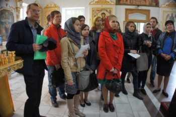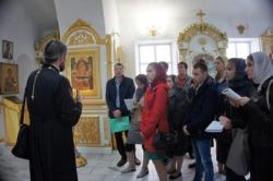 Как и любое доброе дело, начали с молитвы, а затем отец Олег провел гостей по всем помещениям храма и прилегающей территории. Он показал и рассказал о главных реликвиях прихода, познакомил с работой тех, кто трудится в храме, провел молодежь на клирос, где во время службы находится хор.