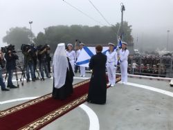 Митрополит Владивостокский и Приморский Вениамин совершил чин освящения Андреевского флага. Владыку сопровождал помощник командующего ТОФ, настоятель военно-морского Андреевского храма на Корабельной набережной Владивостока иерей Сергий Галанов.