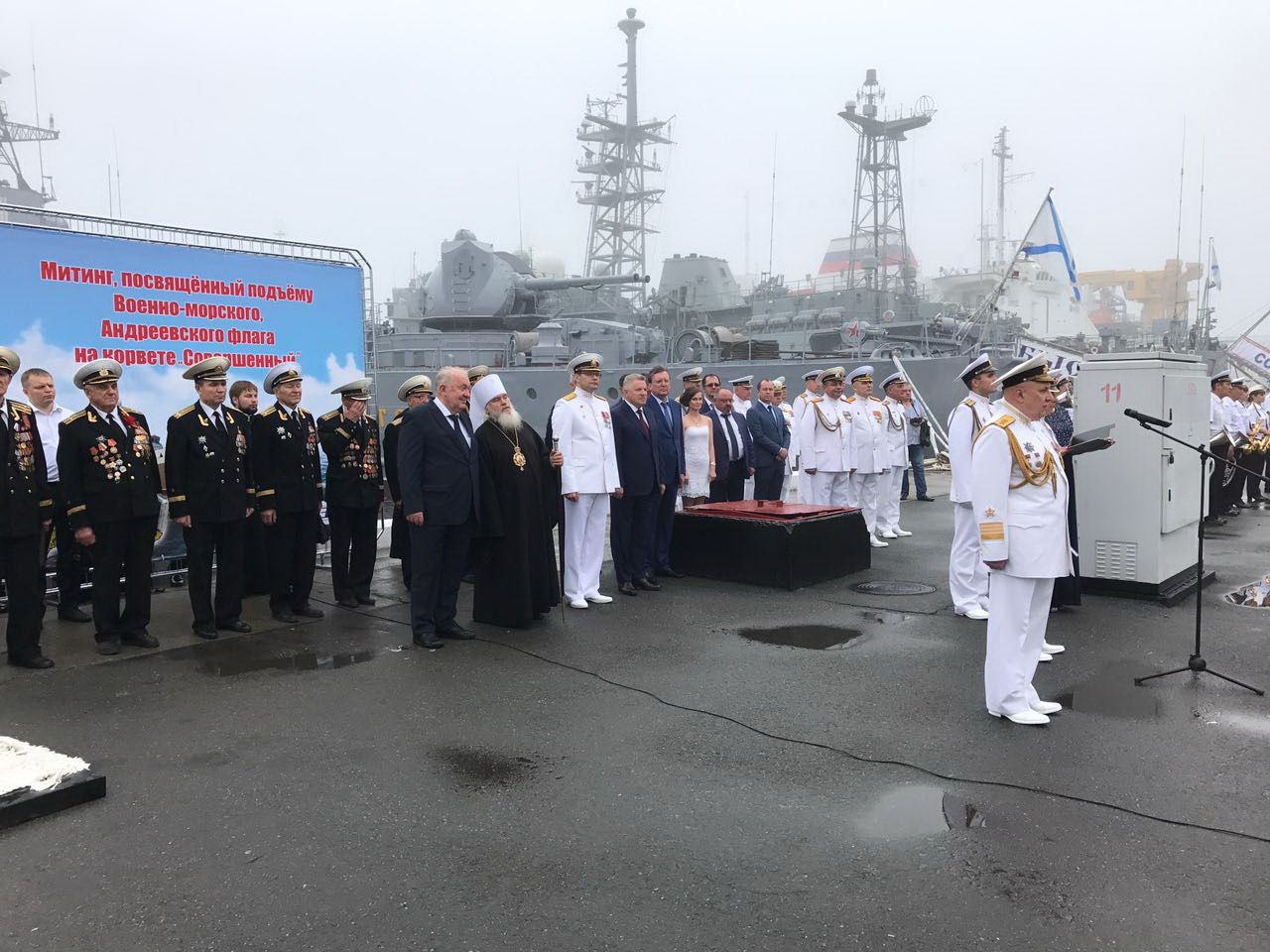 Владивосток. Торжественная церемония подъёма военно-морского флага РФ на новейшем корвете «Совершенный» состоялась во Владивостоке. В торжественном митинге приняли участие командующий ТОФ адмирал Сергей Авакянц, представители командования флота, завода, администрации края и ветераны ВМФ.