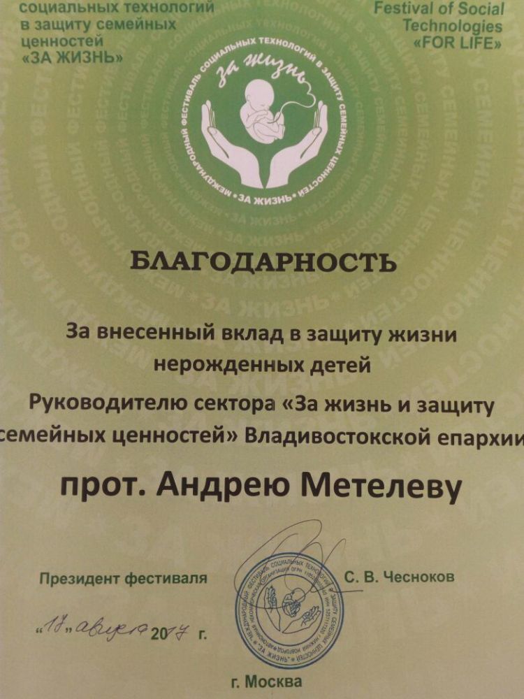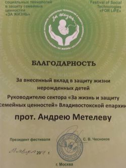 За работу по спасению нерождённых жизней Благодарности от Президента фестиваля П.Чеснокова удостоены руководитель епархиального отдела по церковной благотворительностии социальному служению протоиерей Александр Талько, протоиерей Андрей Метелёв, психолог Елена Волошина и благочинный V округа, настоятель Покровского храма в селе Покровка иерей Стефан Цуркан.