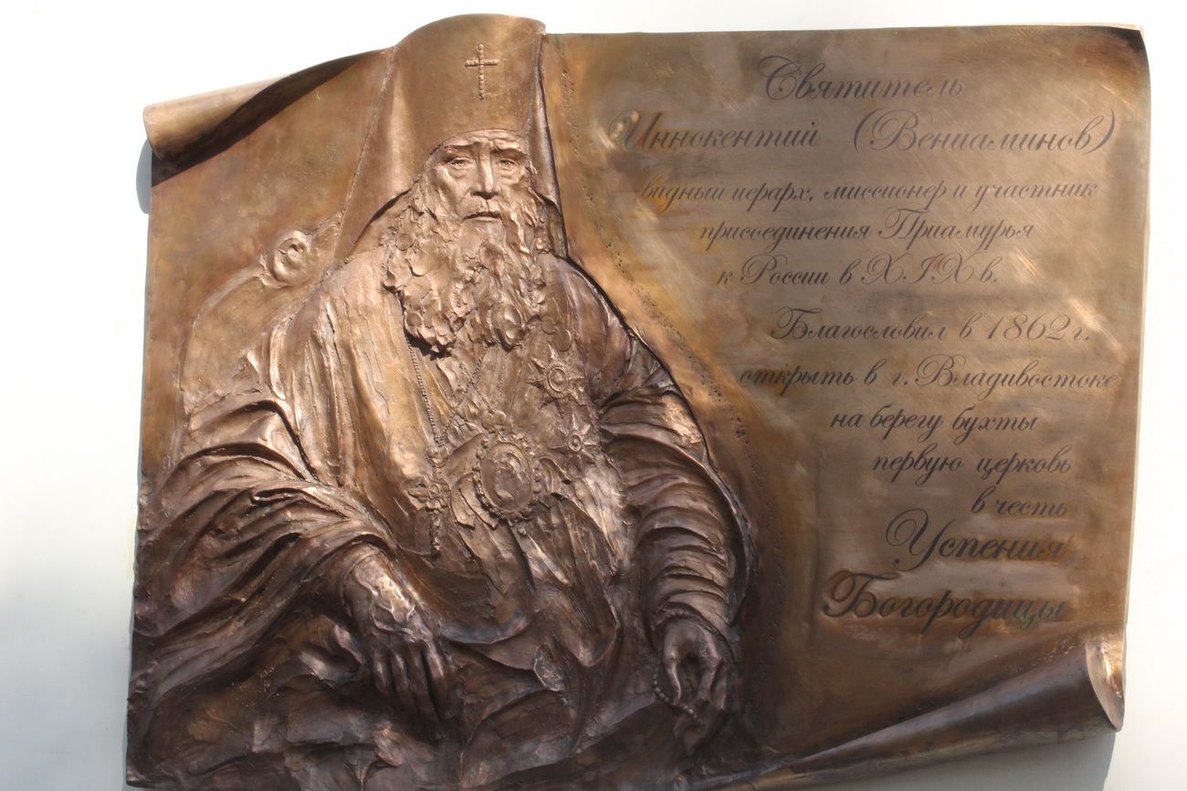 Барельеф изготовлен из бронзы в Москве. Скульптор Алексей Селиванов. Работа продолжалась полгода – с февраля по август 2017 г. На доске написано: "Святитель Иннокентий (Вениаминов) видный иерарх, миссионер и участник присоединения Приамурья к России в XIX веке. Благословил в 1862 году открыть в г. Владивостоке на берегу бухты первую церковь в честь Успения Богородицы".