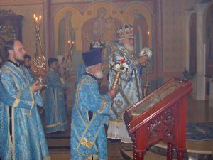 Накануне, 3 ноября владыка Вениамин совершил всенощное бдение в Казанском храме г. Владивостока. В этот день выносят из алтаря хранящуюся там особо чтимую икону Божией Матери "Казанская".