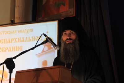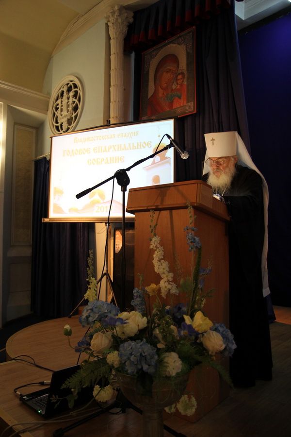 27 декабря состоялось Годовое собрание Владивостокской епархии, собравшееся в помещении актового зала Казанского храма г. Владивостока. Заседание возглавил митрополит Владивостокский и Приморский Вениамин. В президиум собрания были избраны: заместитель председателя собрания—викарий Владивостокской епархии епископ Уссурийский Иннокентий; секретарь собрания — клирик Серафимовского храма Владивостока протоиерей Игорь Шевчук.