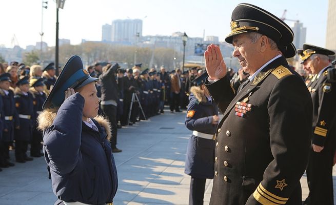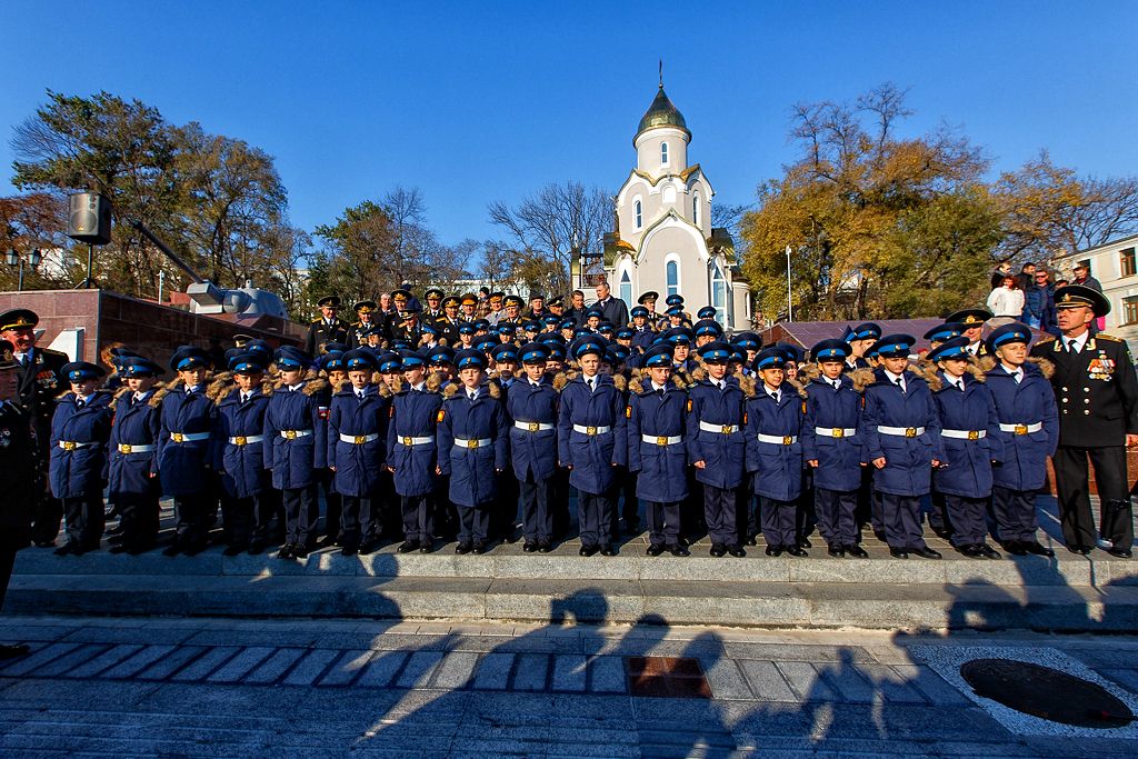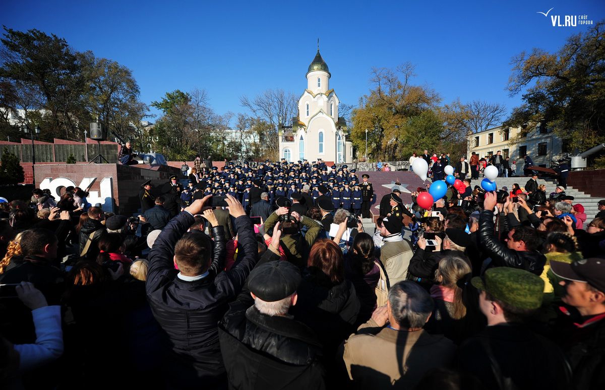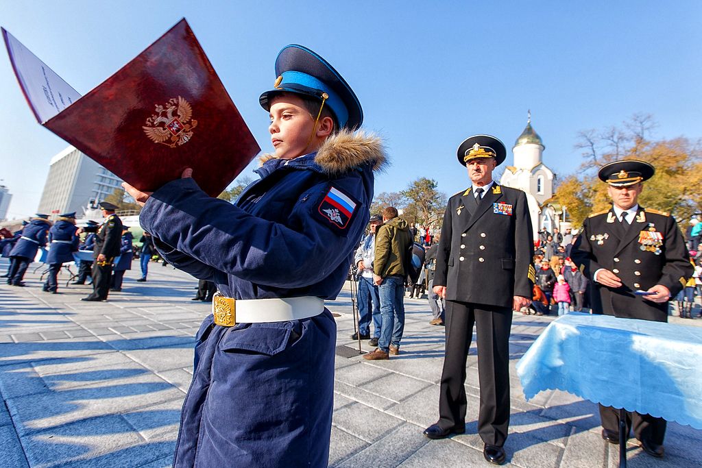Владивосток. На Корабельной набережной у мемориала «Боевая слава Тихоокеанского флота» состоялась торжественная церемония посвящения в кадеты Владивостокского Президентского кадетского училища. Около 90 пятиклассников, еще вчера имевших статус только воспитанников, стали кадетами – приняли присягу и получили удостоверения. Церемония началась с исполнения гимна Российской Федерации. Перед воспитанниками, кадетами, их учителями и родителями выступили вице-губернатор Приморья Александр Лось, глава администрации Владивостока Игорь Пушкарев и другие официальные лица.
