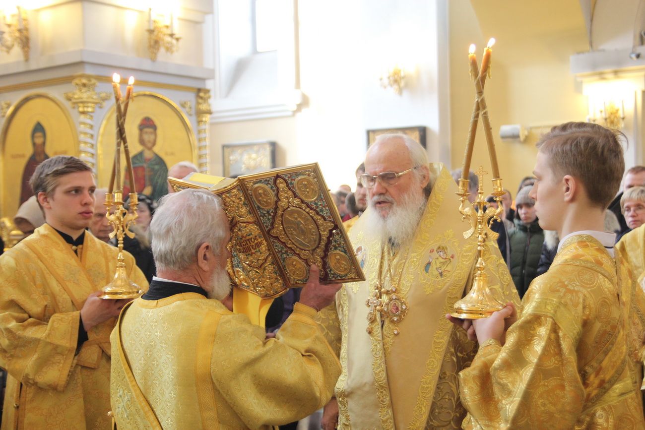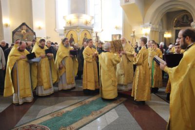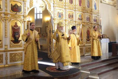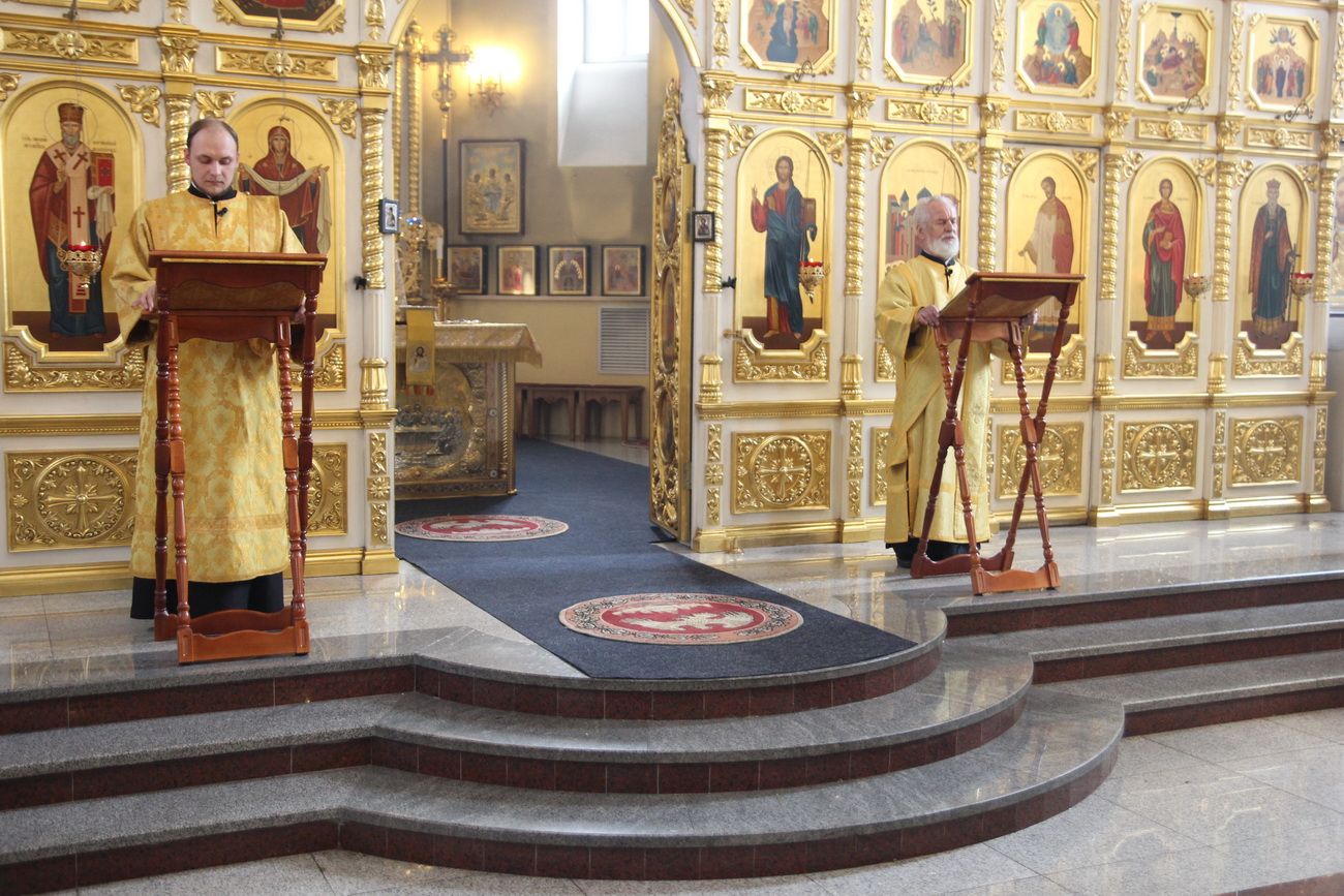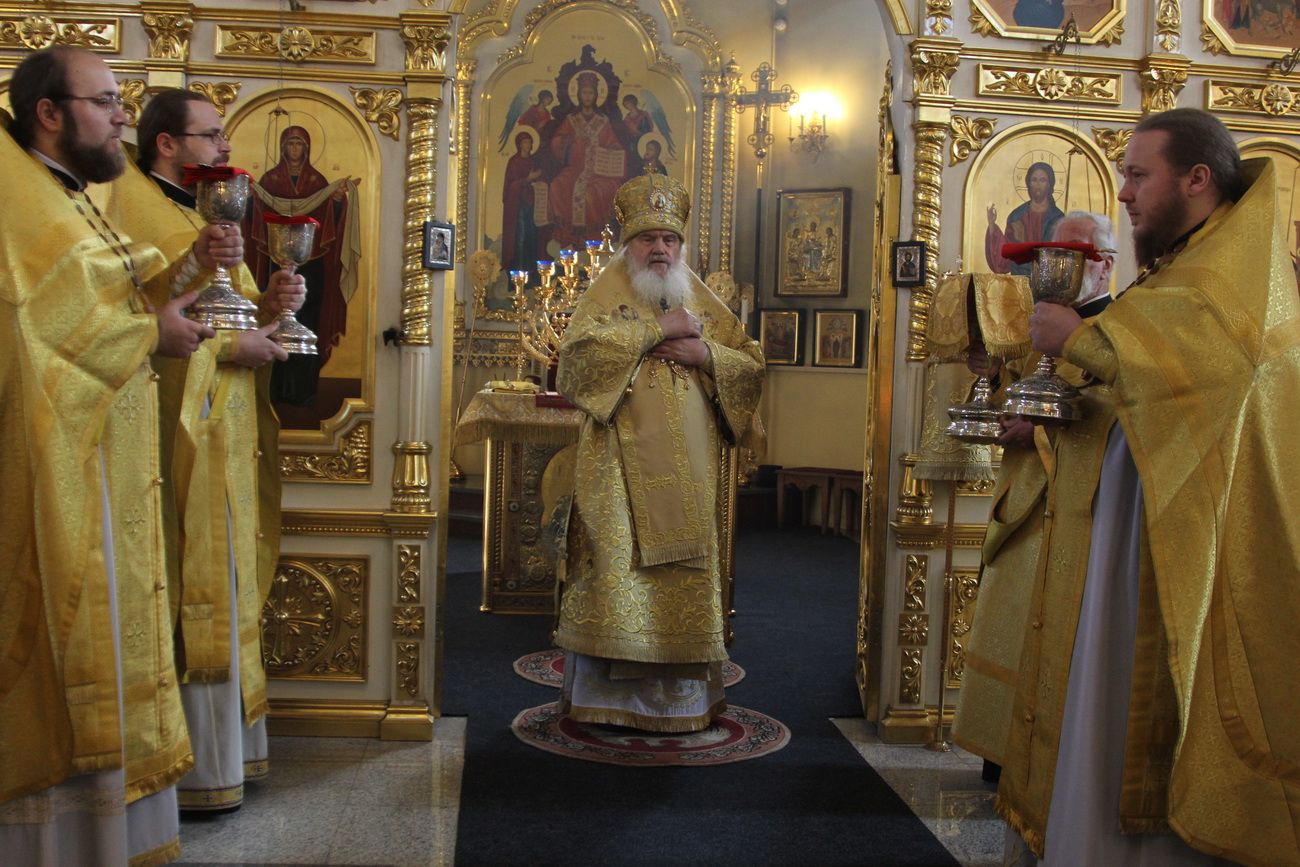 Его высокопреосвященству сослужили благочинный I округа протоиерей Димитрий Федорин, ключарь собора протоиерей Александр Талько и духовенство собора.