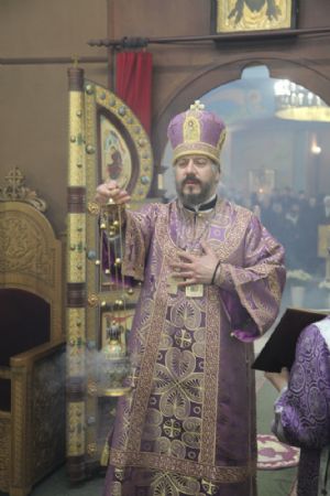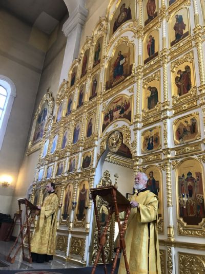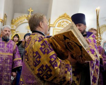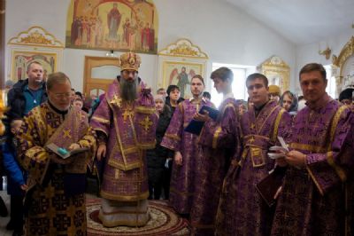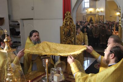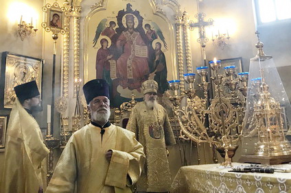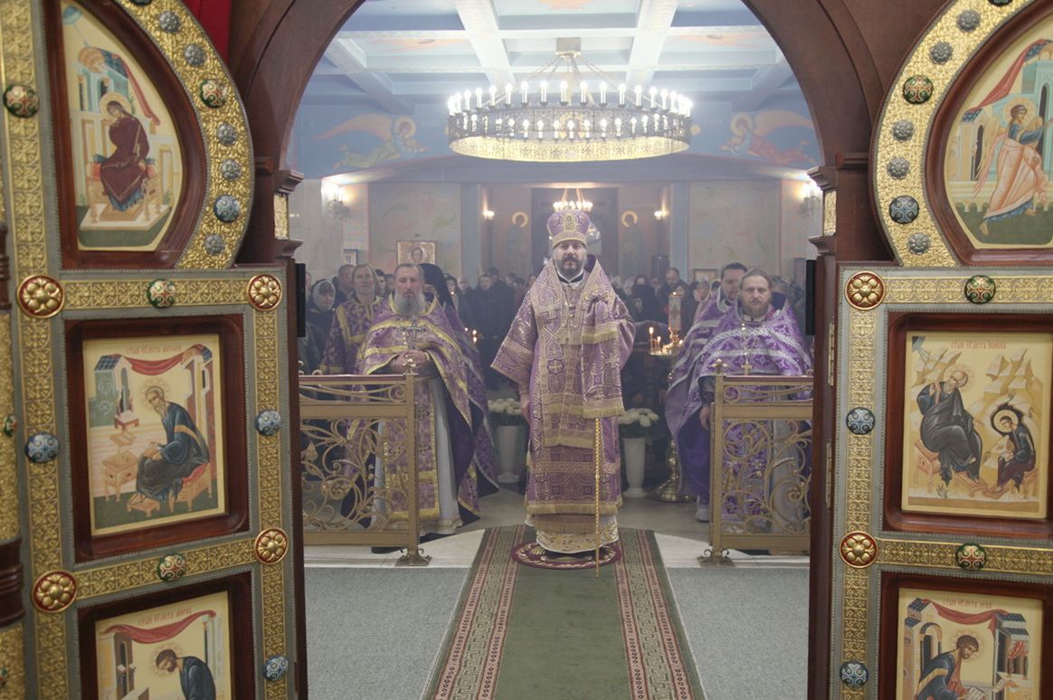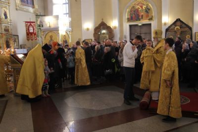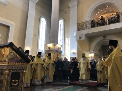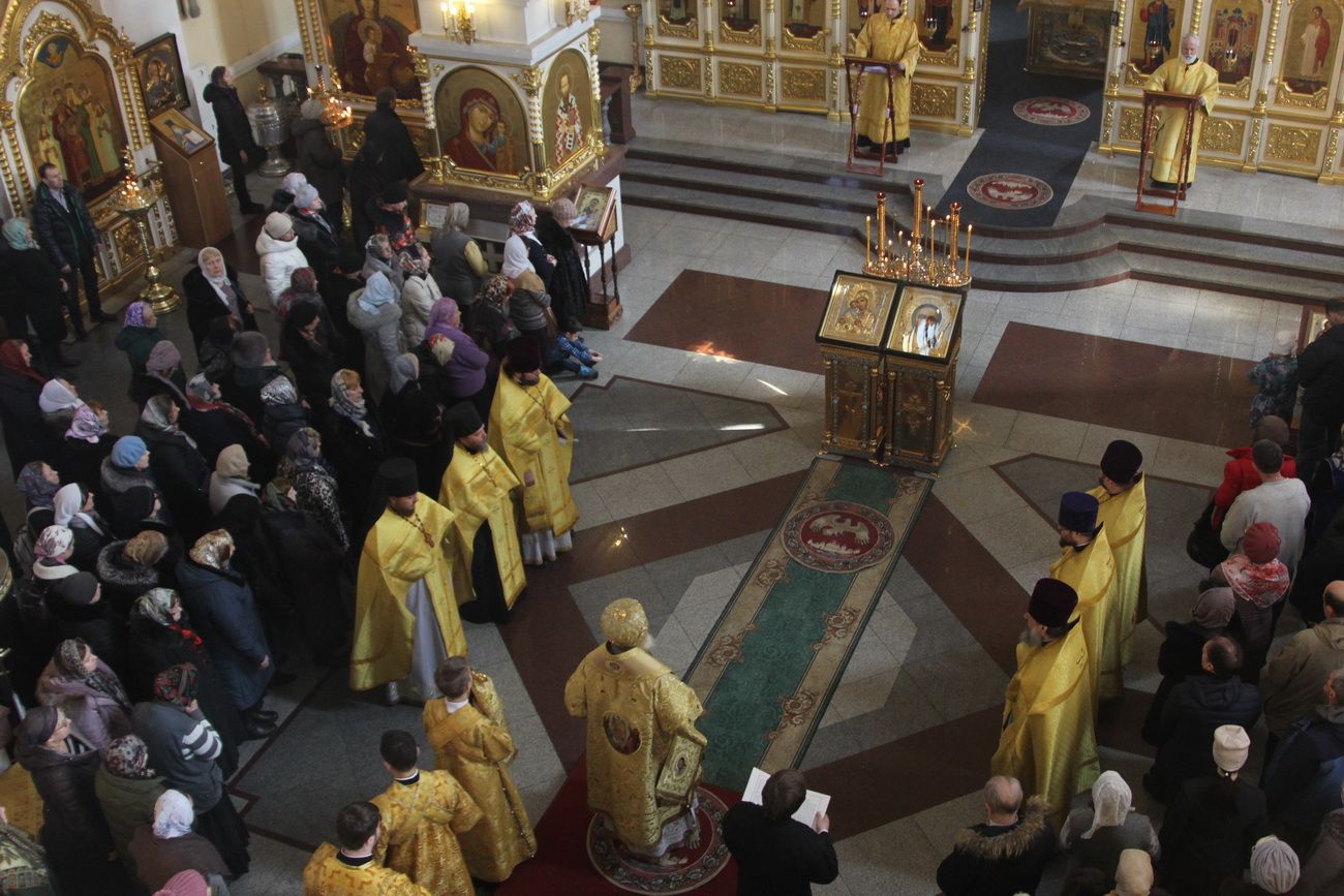 Его высокопреосвященству сослужили благочинный I округа протоиерей Димитрий Федорин, ключарь собора протоиерей Александр Талько и духовенство собора.