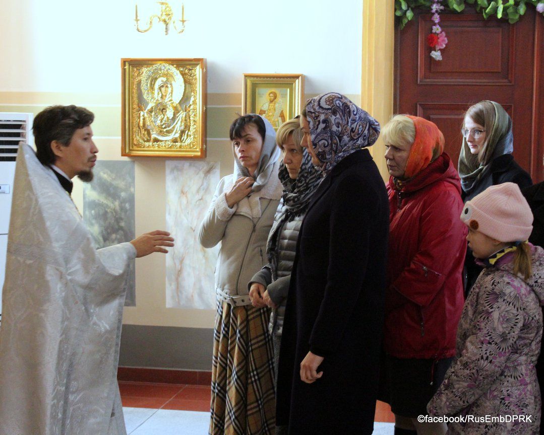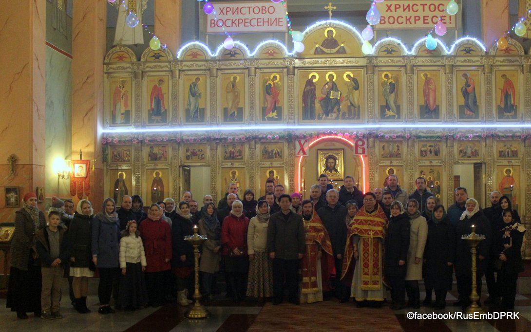 Пхеньян. 7-8 апреля 2018 года по благословению архиепископа Солнечногорского Сергия, управляющего приходами в Северо-Восточной и Восточной Азии состоялся приуроченный к празднику Пасхи визит церковной делегации из Приморской митрополии в Свято-Троицкий храм г. Пхеньяна (КНДР). Поездка проходила по приглашению Православного комитета КНДР. В делегацию от Приморской митрополии вошли протоиерей Евгений Копысов клирик Покровского храма Уссурийска и певчая Успенского храма Владивостока Лариса Бурнаева.