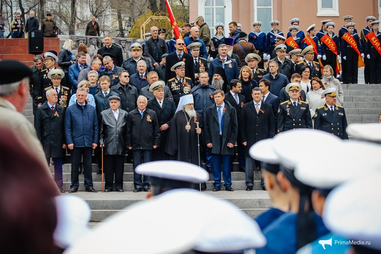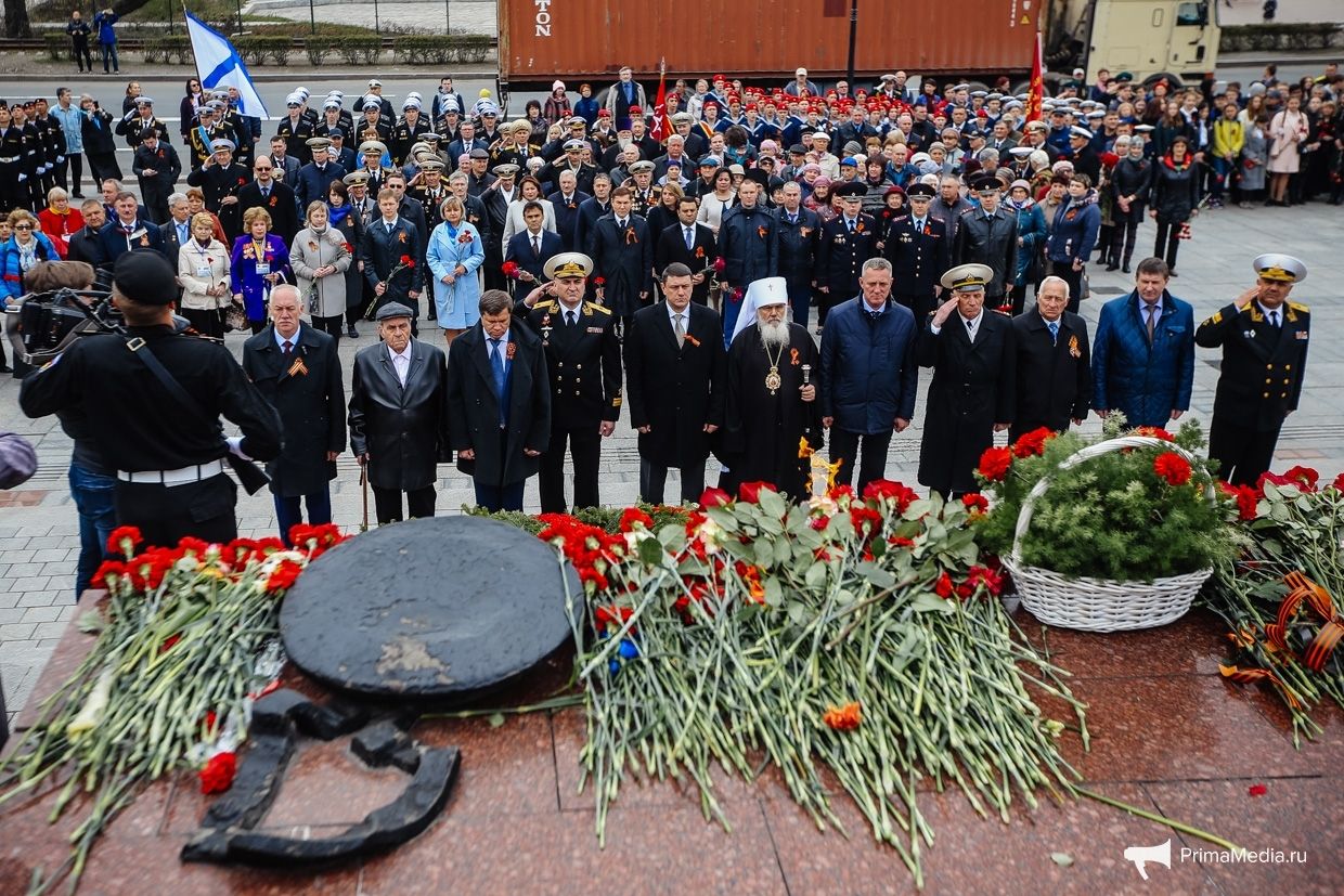 Завершились торжественные мероприятия в честь 73-й годовщины Великой Победы возложением гирлянды и цветов к Вечному огню мемориала «Боевая слава Тихоокеанского флота», минутой молчания и торжественным маршем роты почётного караула ТОФ, курсантов и оркестра.