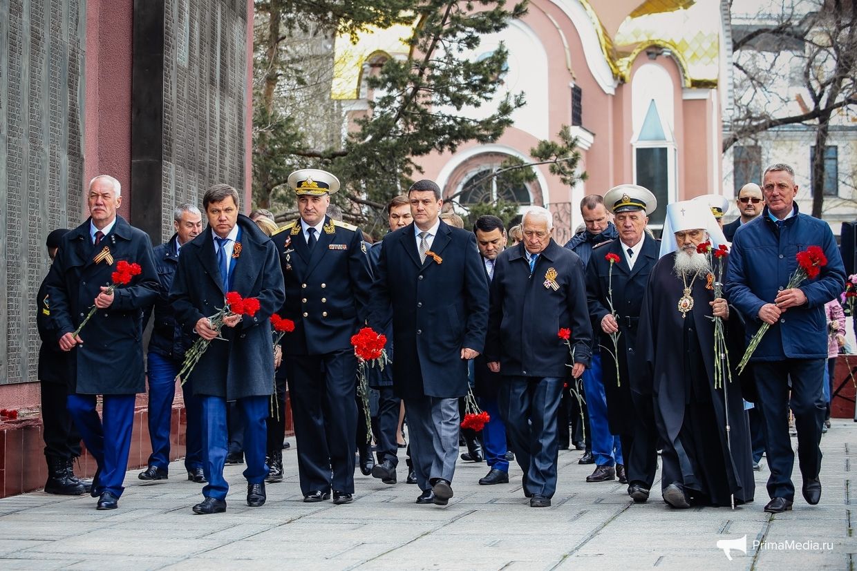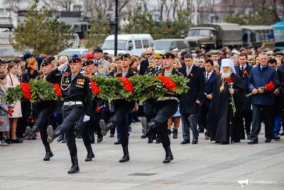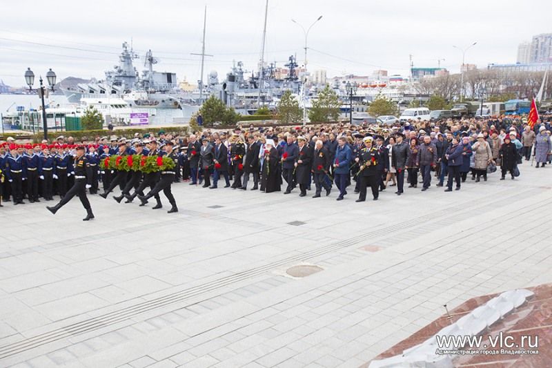 У стелы «Владивосток – город воинской славы», Стены памяти героев-владивостокцев, погибших в годы Великой Отечественной войны, и у Вечного огня мемориала «Боевая слава ТОФ» на Корабельной набережной возложили цветы. В акции приняли участие фронтовики и труженики тыла, временно исполняющий обязанности Губернатора Приморского края Андрей Тарасенко, глава Владивостока Виталий Веркеенко, председатель краевого совета ветеранов Дмитрий Григорович, представители командования Тихоокеанским флотом и администрации Приморского края, городского совета ветеранов и депутатского корпуса, трудовых коллективов, общественных организаций, школьники и студенты.