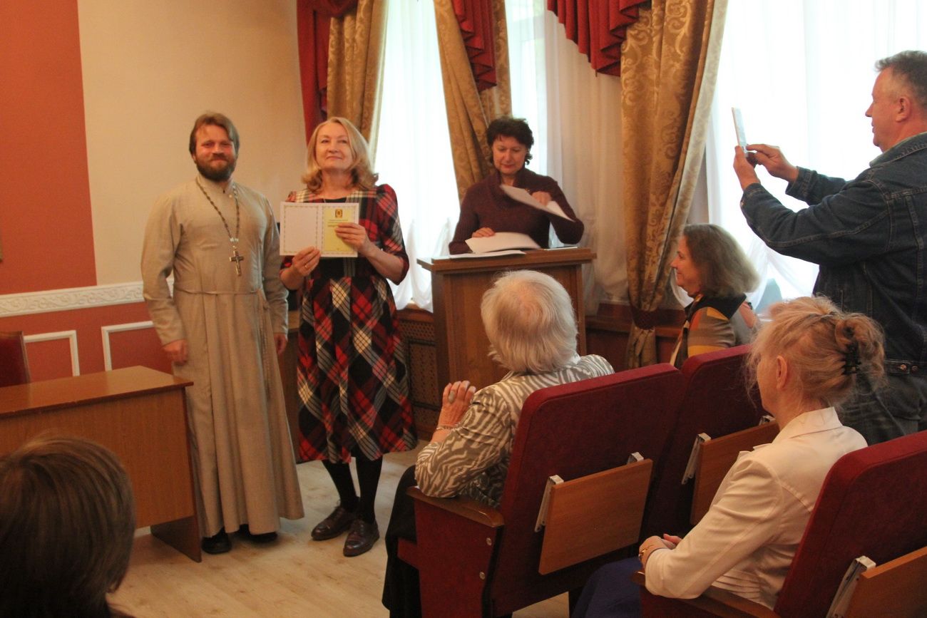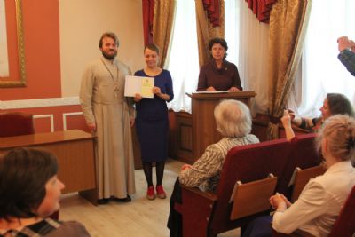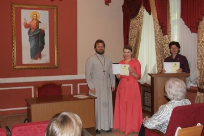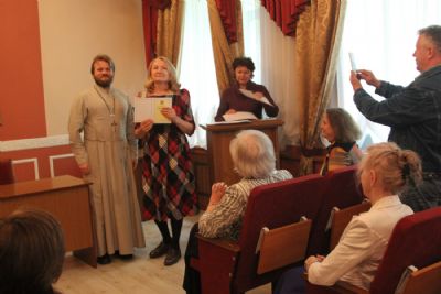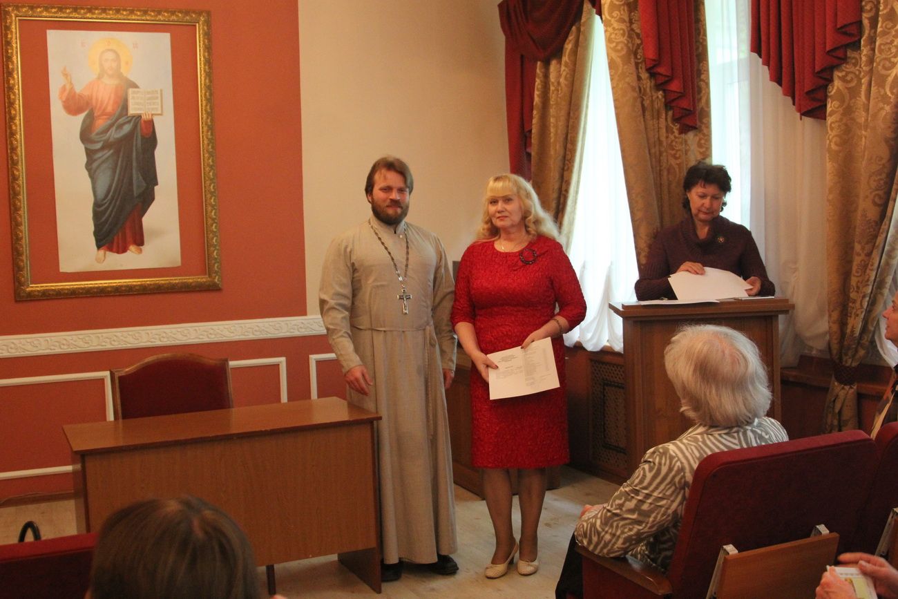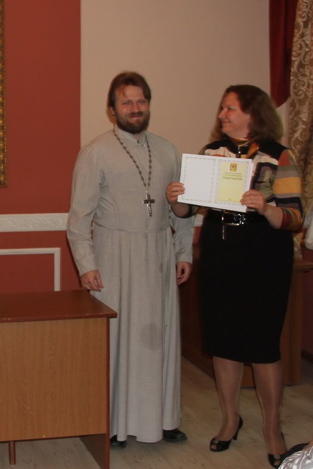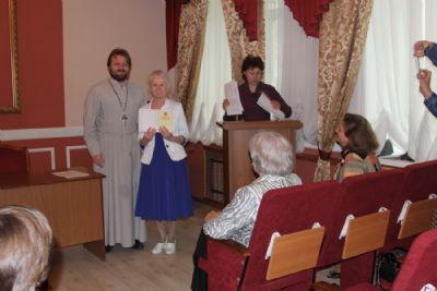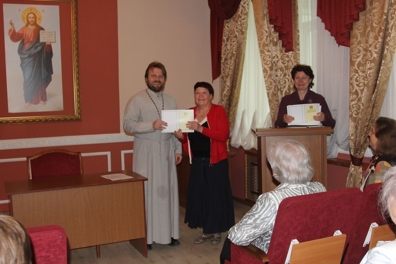Затем участники вечера направились в актовый зал Духовного центра, где состоялось вручение свидетельств об окончании катехизических курсов. Выпускников поздравила руководитель Катехизических курсов, специалист епархиального отдела религиозного образования и катехизации Ирина Степановна Латышева. На выпускном акте также присутствовала преподаватель центра Татьяна Ивановна Гончарова.