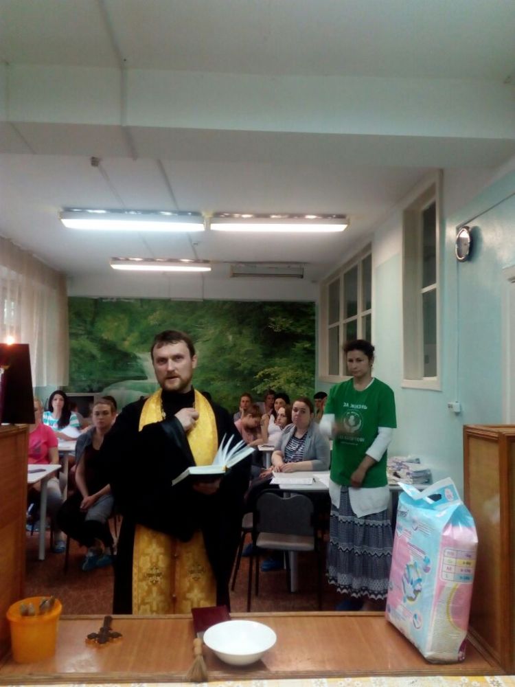 По окончании молебна состоялась беседа. Отец Кирилл рассказал о святых Петре и Февронии, о том, как понимает Православная Церковь любовь и семейные отношения. Отец Кирилл особо поздравил будущую маму, которая ожидает двойню – подарил ей упаковку памперсов, которые понадобятся малышам. С ней работала психолог кризисного центра, которая отговорила её от аборта. Таких женщин не оставляют после решения дать ребёнку жизнь – помогают продуктами, детской одеждой и пр.