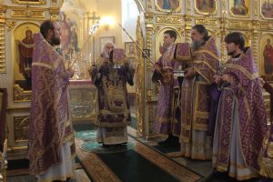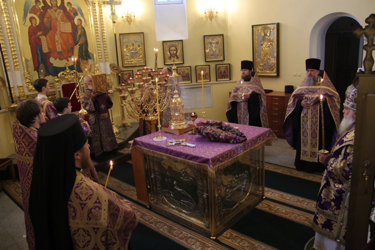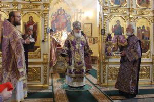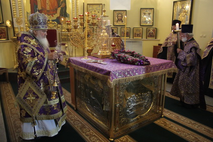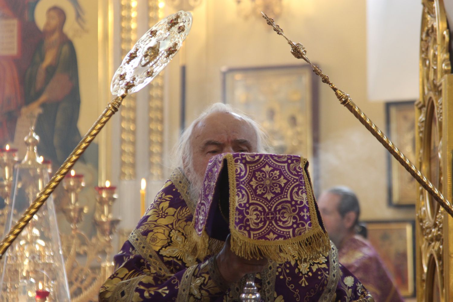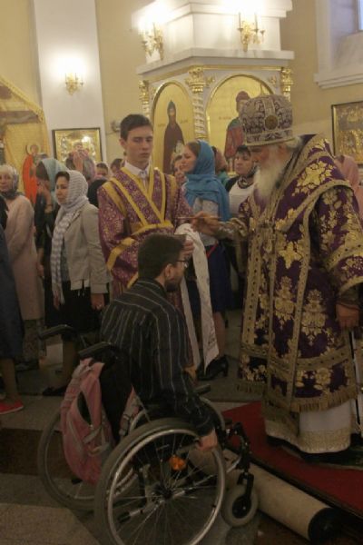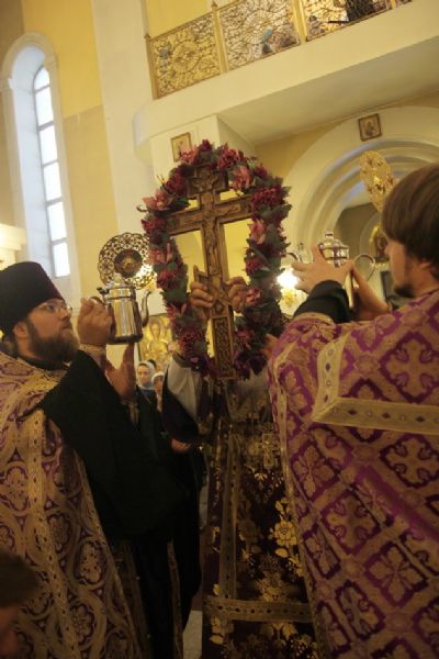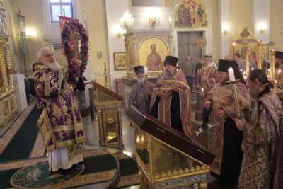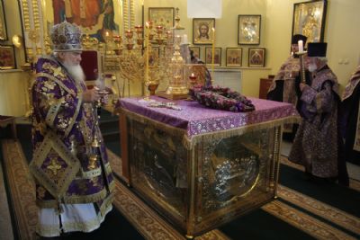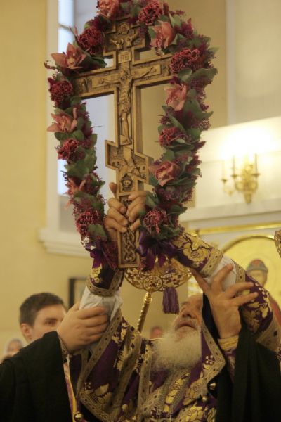 После великого славословия глава Приморской митрополии совершил чин Воздвижения Креста. Богослужебные песнопения исполнил митрополичий хор под управлением регента Л.И. Макаренко, участницы Патриаршего совета по развитию церковного пения.