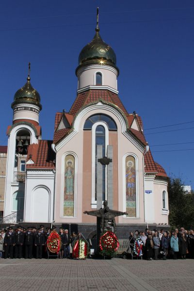 Церемония традиционно прошла у храма в честь святого благоверного князя Игоря Черниговского, у стен которого находится мемориал памяти сотрудников МВД.