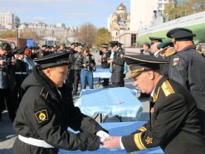 Владивосток. 27 октября 2018 года на Корабельной набережной у мемориала «Боевая слава ТОФ» состоялась церемония посвящения в нахимовцы учащихся филиала Нахимовского военно-морского училища. Восемьдесят воспитанников Нахимовского военно-морского училища произнесли слова торжественного обязательства и получили знаки отличия.