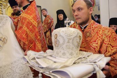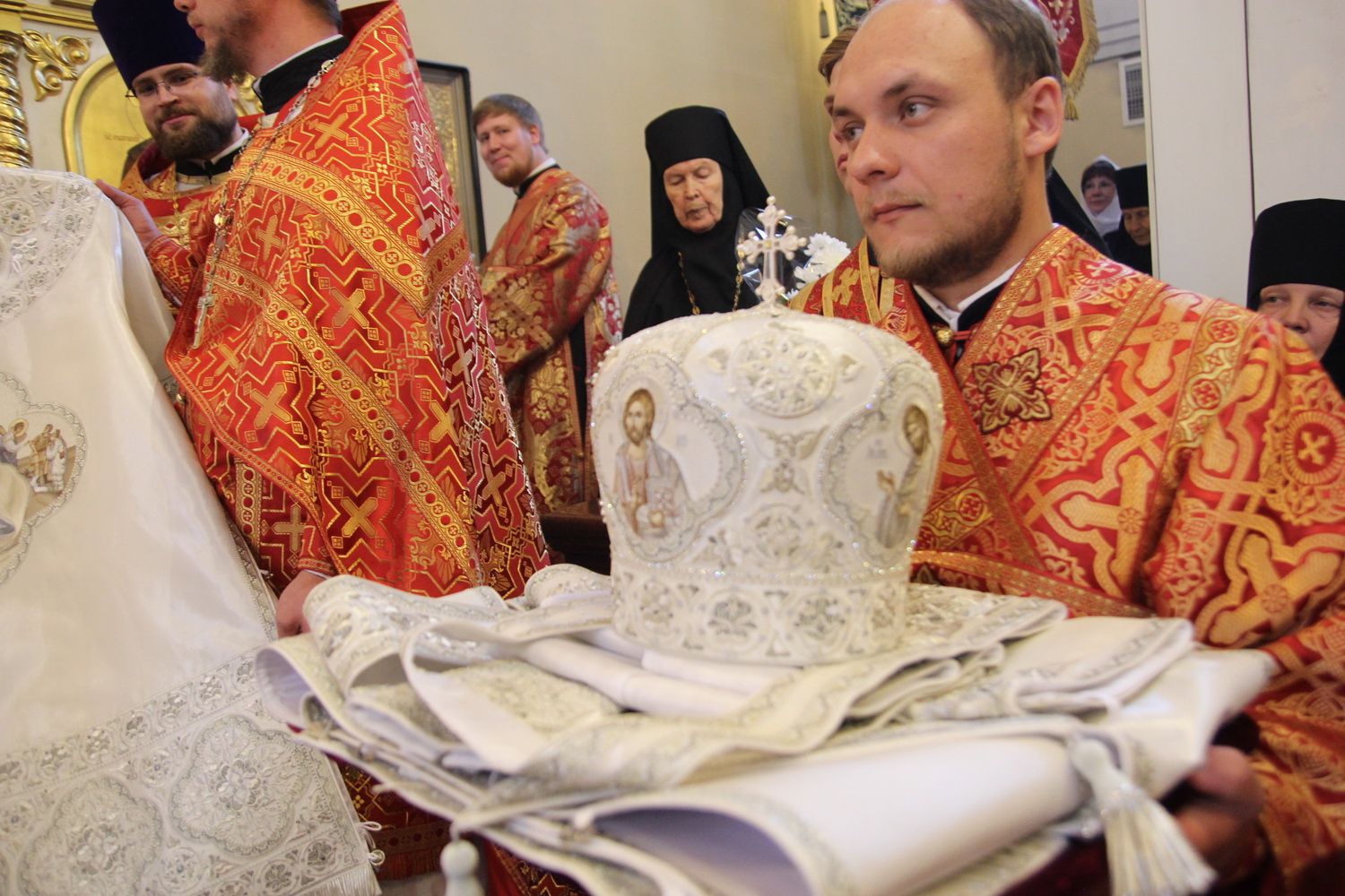 Епископ Иннокентий поздравил владыку Вениамина от всего епископата митрополии, от священнослужителей и верующих, преподнеся митрополиту образ Божией Матери "Казанская"и знаки архиерейского служения из архиерейского облачения.