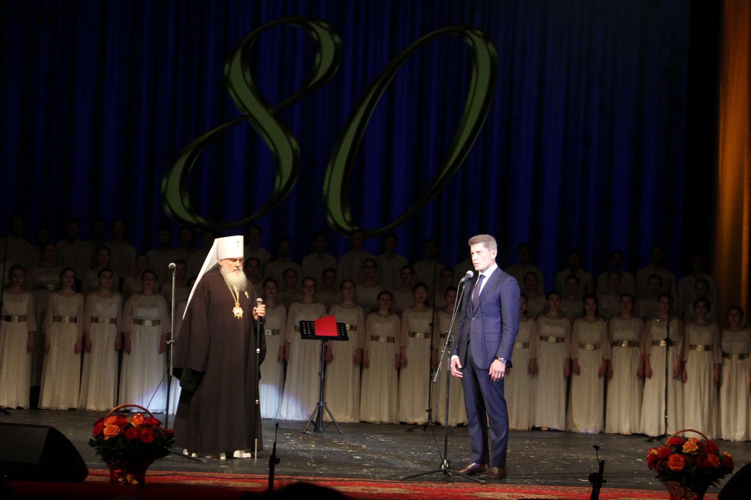 Олег Николаевич Кожемяко в своем приветственном слове митрополиту сказал: «Ваше служение началось в непростое время, после 70-летнего противостояния церкви и власти. Народу требовались духовные идеалы, была потребность в отеческом совете. Именно вы в это время прикладывали все силы и старания, и люди обрели веру, начали строить церкви и приходы. За эти годы появилось более 190 приходов, 50 еще находятся в стадии строительства».