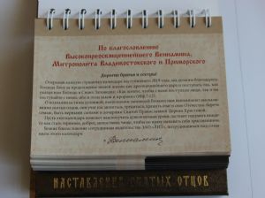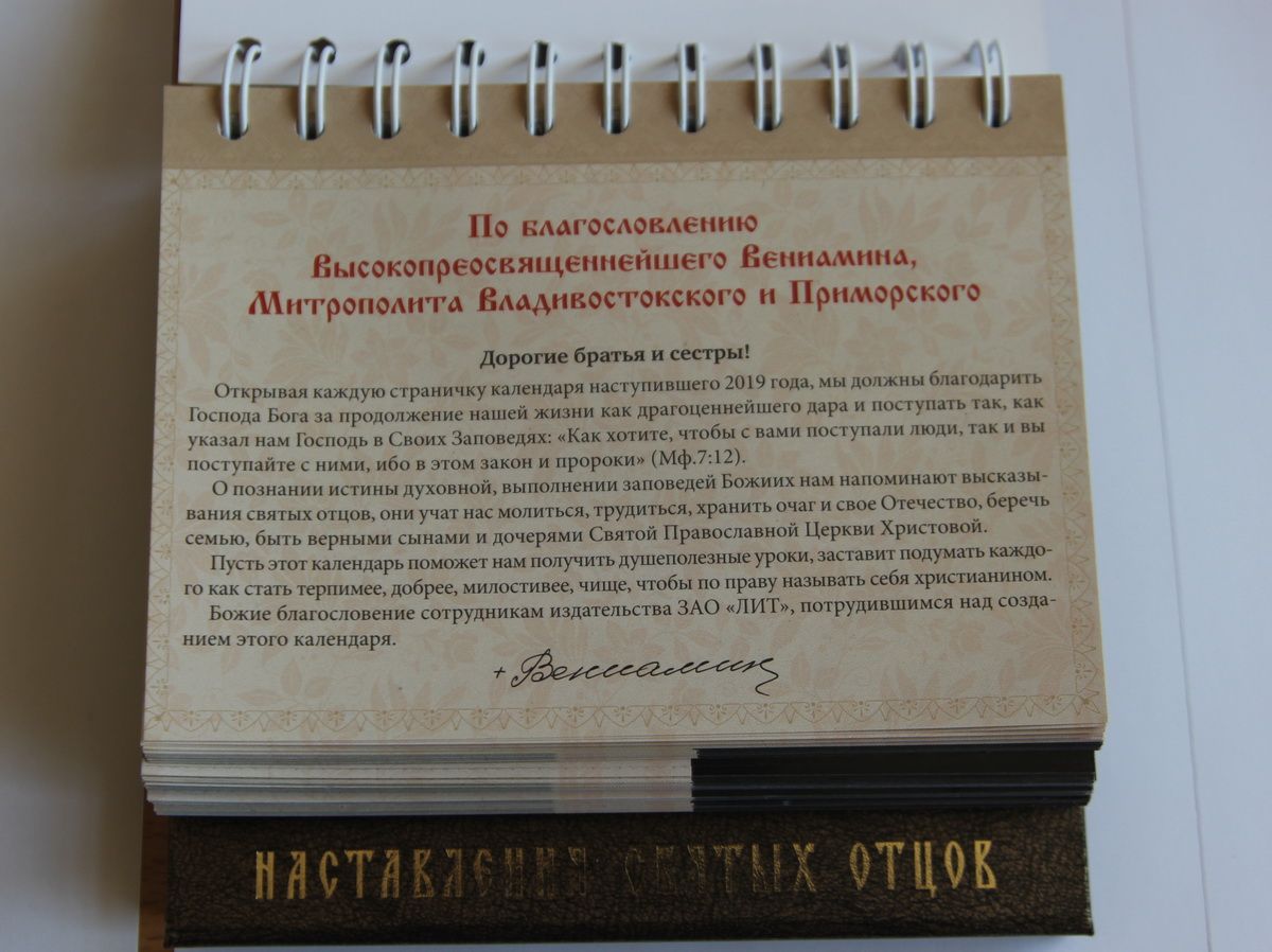 Владивосток. По благословению митрополита Владивостокского и Приморского Вениамина издательство «ЛИТ» выпустило настольный православный календарь «Наставления святых отцов».