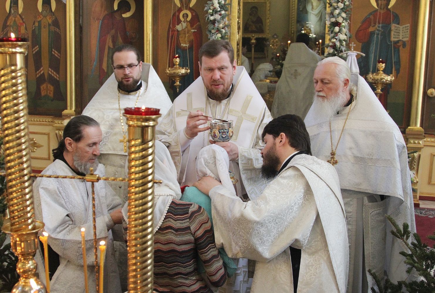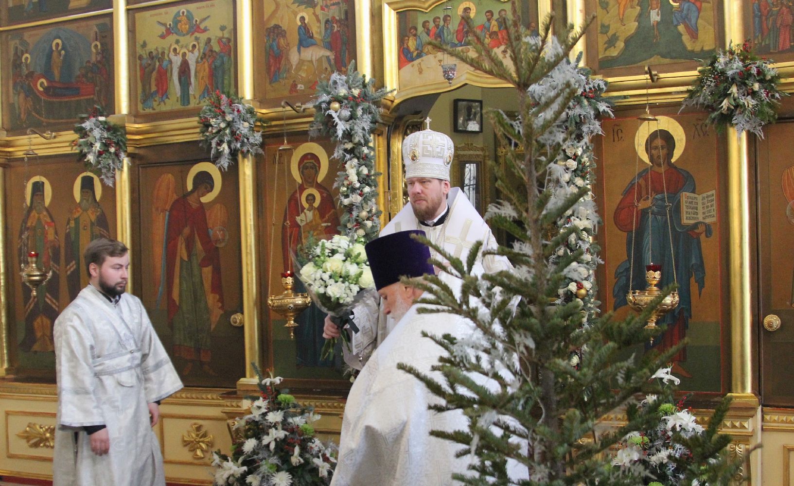 По совершении Евхаристии ключарь собора поблагодарил правящего архиерея за совместное богослужение. По случаю первого посещения новым архипастырем Свято-Никольского собора и продолжающимися Святочными днями, протоиерей Виктор Жильцов преподнес владыке Владимиру букет белых цветов, пожелав духовного и телесного здравия и Божиего благословения в его Архипастырском служении.