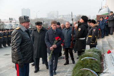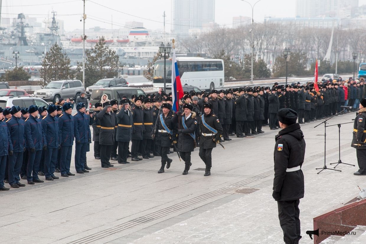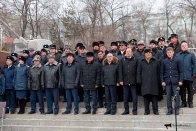 На торжественном мероприятии у мемориала "Боевая слава ТОФ" присутствовали руководитель управления учебной и воспитательной работы Следственного комитета РФ, Герой Российской Федерации, генерал-майор юстиции Сергей Петров, ветераны Великой Отечественной войны и почетные граждане Владивостока, руководители региональных правоохранительных органов, ветераны Великой Отечественной воны, представитель Владивостокской и Приморской метрополии, общественные организации, вооруженные силы Тихоокеанского флота, студенты высших учебных заведений, Всероссийское военно-патриотическое общественное движение "Юнармия", воспитанники подшефного детского дома пгт. Новошахтинский, воспитанники ФГБОУ "Всероссийский детский центр "Океан" и губернатор Приморского края Олег Кожемяко.